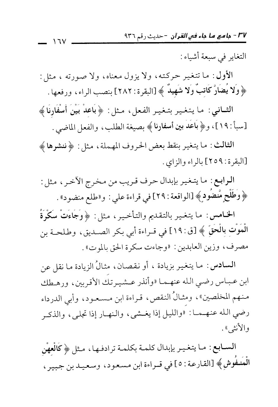السادس: ما يتغير بزيادة، أو نقصان، مِثالُ الزيادة ما نقل عن ابن عباس رضي الله عنهما "وأنذر عشيرتك الأقربين، ورهطك منهم المخلصين"، ومِثالُ النقص، قراءة ابن مسعود، وأبي الدرداء رضي الله عنهما: "والليل إذا يغشى، والنهار إذا تجلى، والذكر والأنثى".
