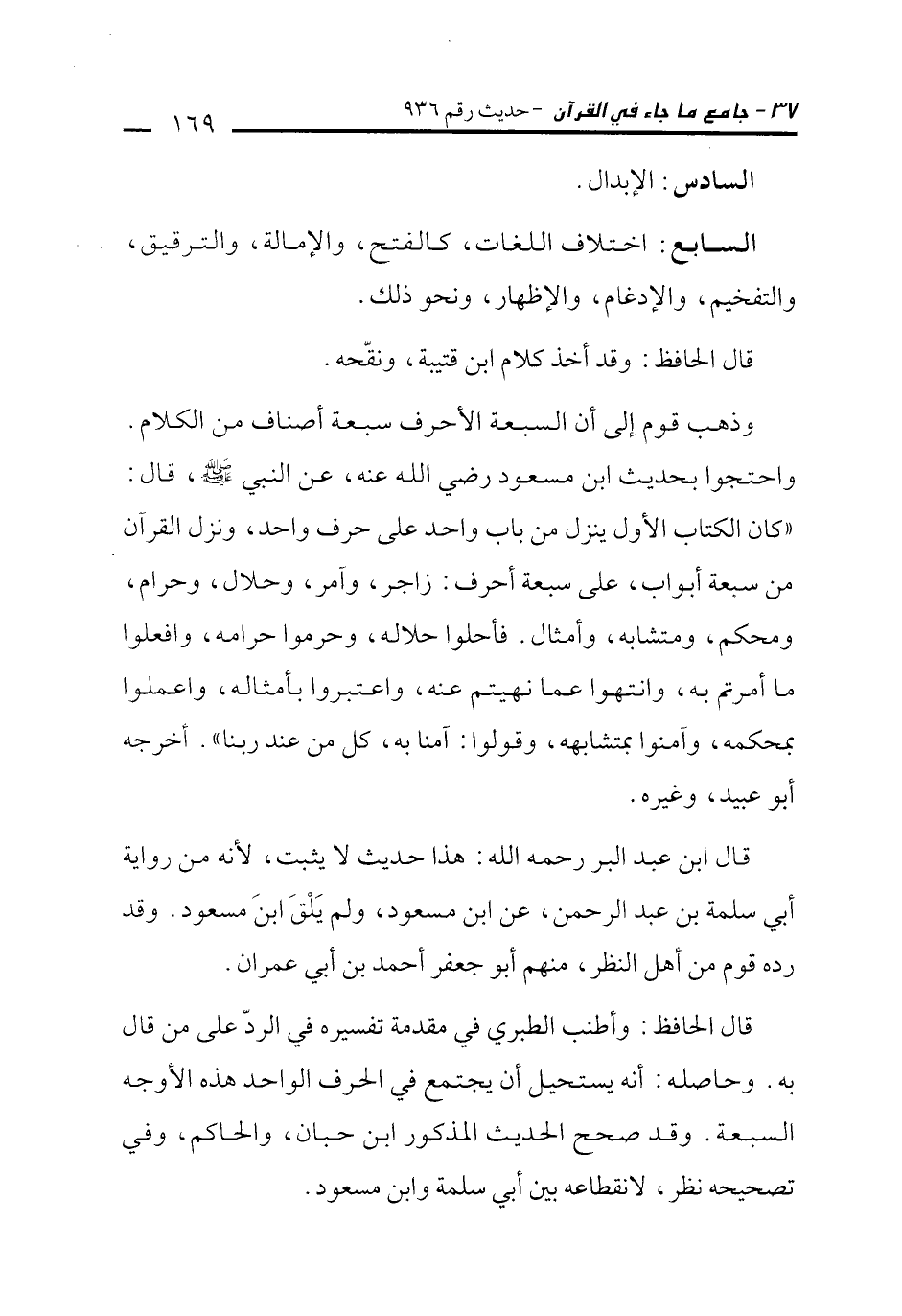 قال الحافظ: وأطنب الطبري في مقدمة تفسيره في الردّ على من قال به. وحاصله: أنه يستحيل أن يجتمع في الحرف الواحد هذه الأوجه السبعة. وقد صحح الحديث المذكور ابن حبان، والحاكم، وفي تصحيحه نظر، لانقطاعه بين أبي سلمة وأبن مسعود.