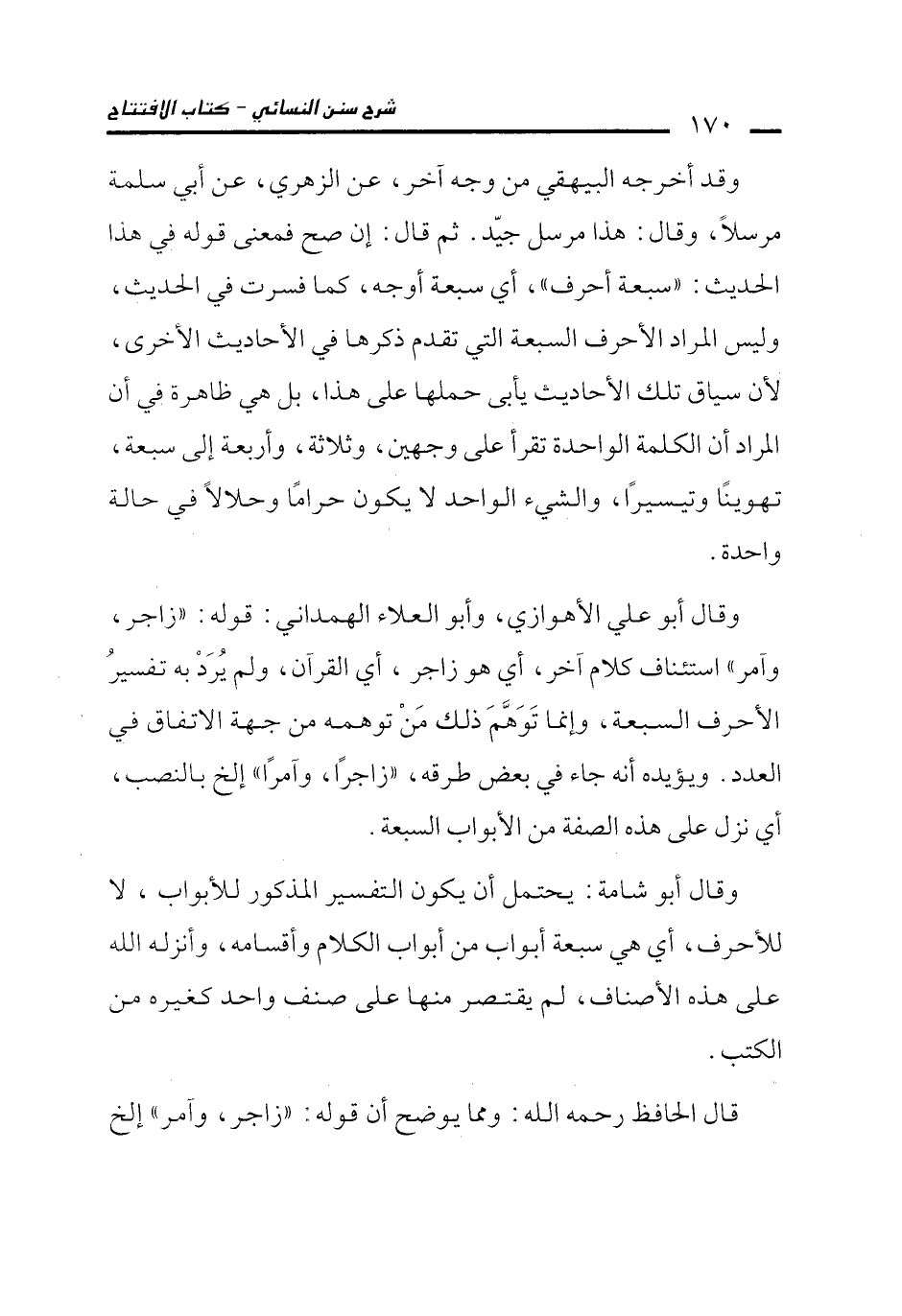 وقال أبو علي الأهوازي، وأبو العلاء الهمداني: قوله: "زاجر، وآمر" استئناف كلام آخر، أي هو زاجر، أي القرآن، ولم يُرَدْ به تفسيرُ الأحرف السبعة، وإنما تَوَهَّمَ ذلك مَنْ توهمه من جهة الاتفاق في العدد. ويؤيده أنه جاء في بعض طوقه، "زاجرًا، وآمرًا" إلخ بالنصب، أي نزل على هذه الصفة من الأبواب السبعة.