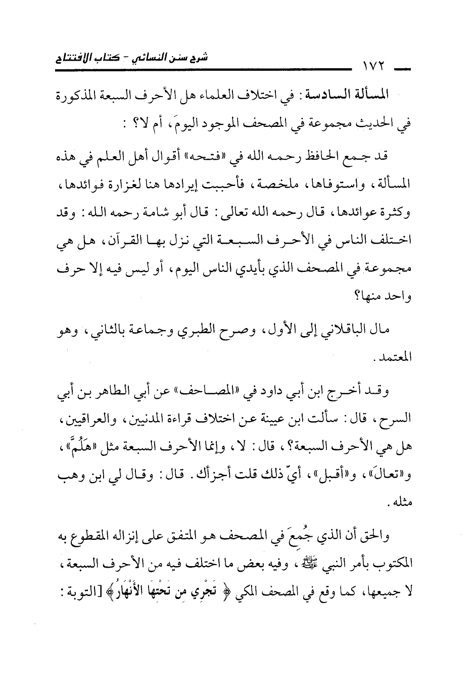 المسألة السادسة: في اختلاف العلماء هل الأحرف الأحرف المذكورة في الحديث مجموعة في المصحف الموجود اليومَ، أم لا؟: