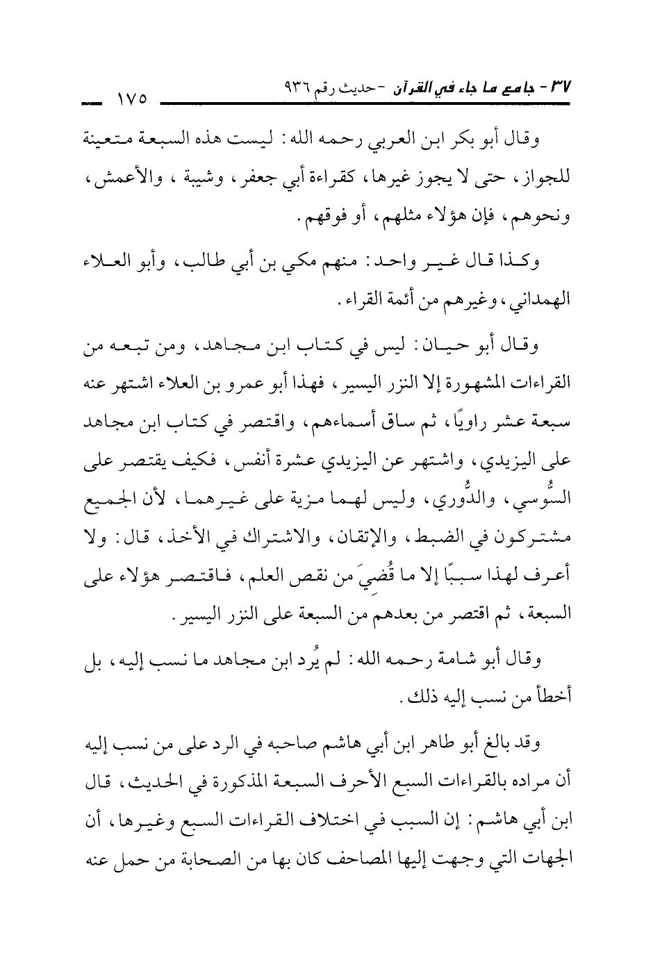 وقال أبو بكر ابن العربي رحمه الله: ليست هذه السبعة متعينة للجواز، حتى لا يجوز غيرها، كقراءة أبي جعفر، وشيبة، والأعمش،