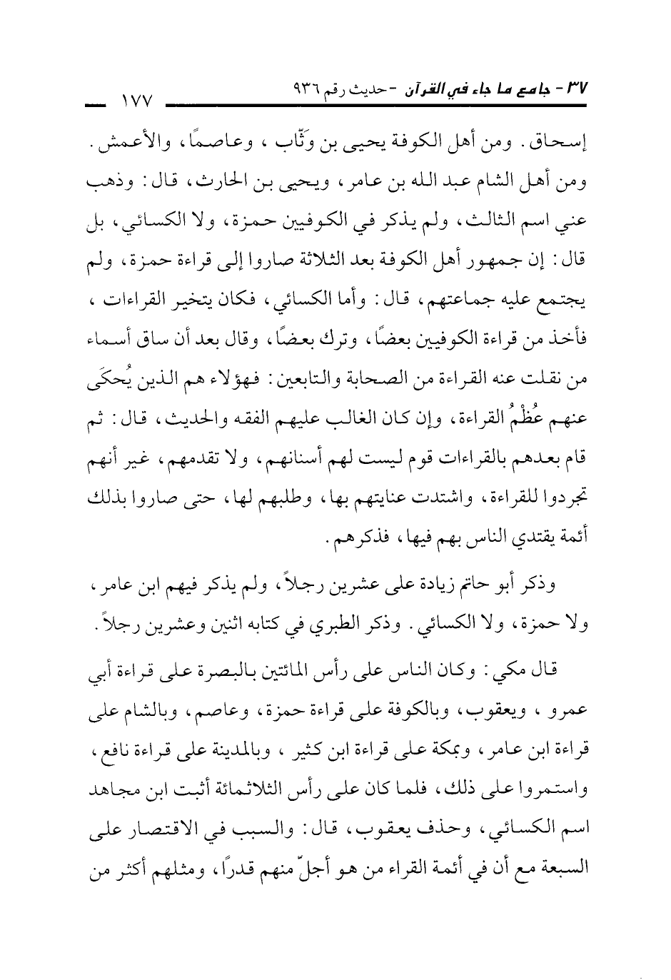 إسحاق. ومن أهل الكوفة يحيى بن وَثّاب، وعاصمًا، والأعمش. ومن أهل الشام عبد الله بن عامر، ويحيى بن الحارث، قال: وذهب عني اسم الثالث، ولم يذكر في الكوفيين حمزة، ولا الكسائي، بل قال: إن جمهور أهل الكوفة بعد الثلاثة صاروا إلى قراءة حمزة، ولم يجتمع عليه جماعتهم، قال: وأما الكسائي، فكان يتخير القراءات، فأخذ من قراءة الكوفيين بعضًا، وترك بعضًا، وقال بعد أن ساق أسماء من نقلت عنه القراءة من الصحابة والتابعين: فهؤلاء هم الذين يُحكَى عنهم عُظْمُ القراءة، وإن كان الغالب عليهم الفقه والحديث، قال: ثم قام بعدهم بالقراءات قوم ليست لهم أسنانهم، ولا تقدمهم، غير أنهم تجردوا للقراءة، واشتدت عنايتهم بها، وطلبهم لها، حتى صاروا بذلك أئمة يقتدي الناس بهم فيها، فذكرهم.