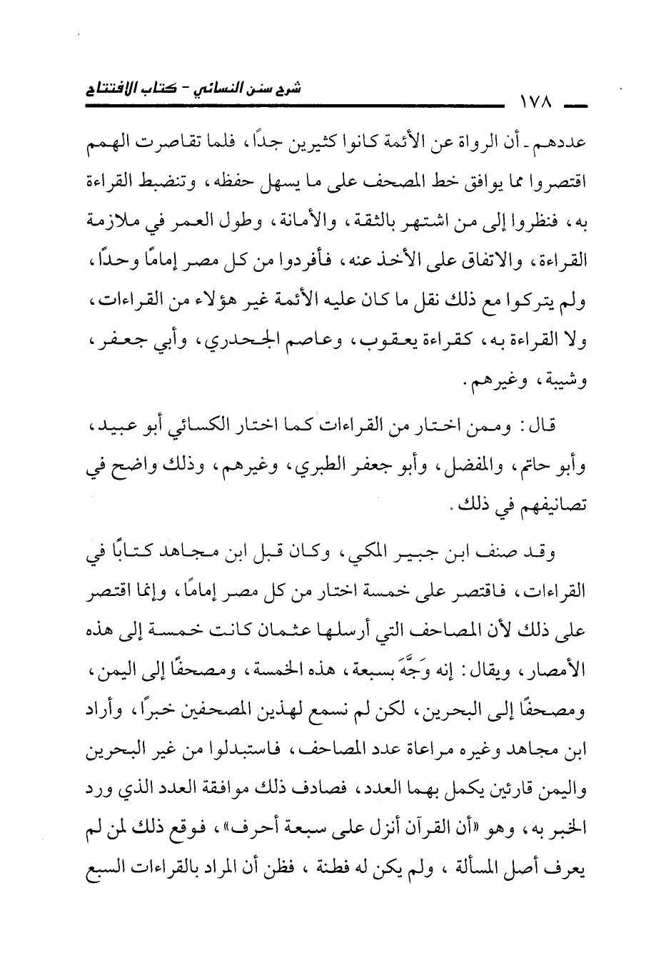 عددهم- أن الرواة عن الأئمة كانوا كثيرين جدًا، فلما تقاصرت الهمم اقتصروا مما يوافق خط المصحف على ما يسهل حفظه، وتنضبط القراءة له، فنظروا إلى من اشتهر بالثقة، والأمانة، وطول العمر في ملازمة القراءة، والاتفاق على الأخذ عنه، فأفردوا من كل مصر إمامًا وحدًا، ولم يتركوا مع ذلك نقل ما كان عليه الأئمة غير هؤلاء من القراءات، ولا القراءة له، كقراءة يعقوب، وعاصم الجحدري، وأبي جعفر، وشيبة، وغيرهم.