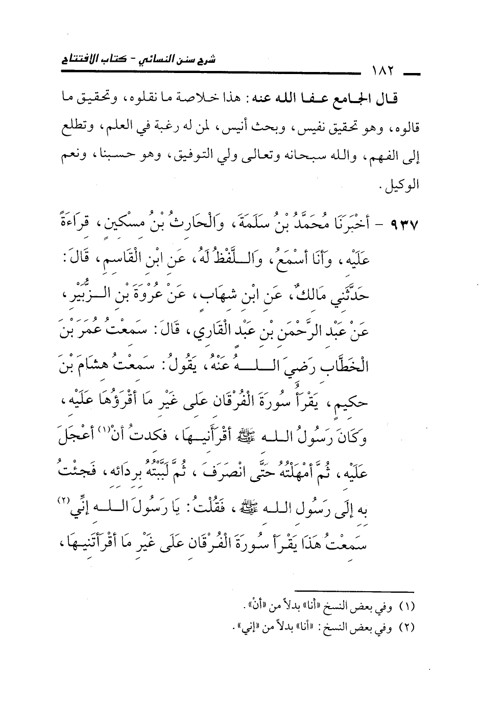 937 - أَخْبَرَنَا مُحَمَّدُ بْنُ سَلَمَةَ، وَالْحَارِثُ بْنُ مِسْكِينٍ، قِرَاءَةً عَلَيْهِ، وَأَنَا أَسْمَعُ، وَاللَّفْظُ لَهُ،- عَنِ ابْنِ الْقَاسِمِ، قَالَ: حَدَّثَنِي مَالِكٌ، عَنِ ابْنِ شِهَابٍ، عَنْ عُرْوَةَ بْنِ الزُّبَيْرِ، عَنْ عَبْدِ الرَّحْمَنِ بْنِ عَبْدٍ الْقَارِيِّ، قَالَ: سَمِعْتُ عُمَرَ بْنَ الْخَطَّابِ رَضِيَ اللهُ عَنْهُ، يَقُولُ: سَمِعْتُ هِشَامَ بْنَ حَكِيمٍ، يَقْرَأُ سُورَةَ الْفُرْقَانِ عَلَى غَيْرِ مَا أَقْرَؤُهَا عَلَيْهِ، وَكَانَ رَسُولُ اللَّهِ - صلى الله عليه وسلم - أَقْرَأَنِيهَا، فَكِدْتُ أَنْ (¬1) أَعْجَلَ عَلَيْهِ، ثُمَّ أَمْهَلْتُهُ حَتَّى انْصَرَفَ، ثُمَّ لَبَّبْتُهُ بِرِدَائِهِ، فَجِئْتُ بِهِ إِلَى رَسُولِ اللَّهِ - صلى الله عليه وسلم -، فَقُلْتُ: يَا رَسُولَ اللَّهِ إِنِّي (¬2) سَمِعْتُ هَذَا يَقْرَأُ سُورَةَ الْفُرْقَانِ عَلَى غَيْرِ مَا أَقْرَأْتَنِيهَا،