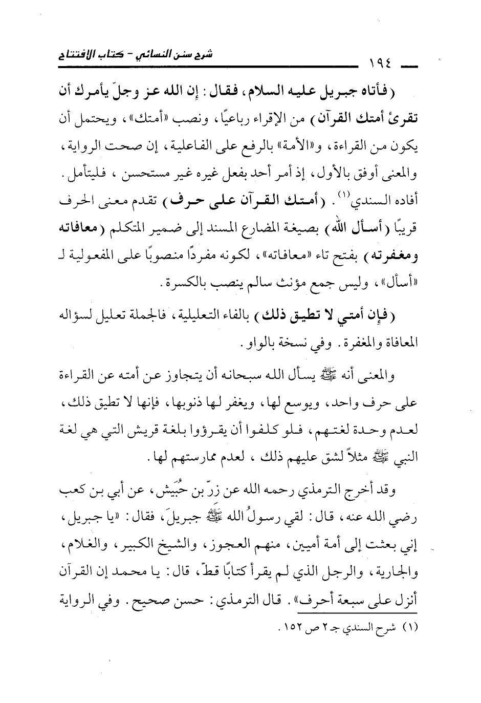 (فأتاه جبريل عليه السلام، فقال: إِن الله عز وجلّ يأمرك أن تقرئ أمتك القرآن) من الإقراء رباعيًا، ونصب "أمتك"، ويحتمل أن يكون من القراءة، و"الأمة" بالرفع على الفاعلية، إن صحت الرواية، والمعنى أوفق بالأول، إذ أمر أحد بفعل غيره غير مستحسن، فليتأمل. أفاده السندي (¬1). (أمتك القرآن على حرف) تقدم معنى الحرف قريبًا (أسأل الله) بصيغة المضارع المسند إلى ضمير المتكلم (معافاته ومغفرته) بفتح تاء "معافاته"، لكونه مفردًا منصوبًا على المفعولية لـ"أسأل"، وليس جمع مؤنث سالم ينصب بالكسرة.