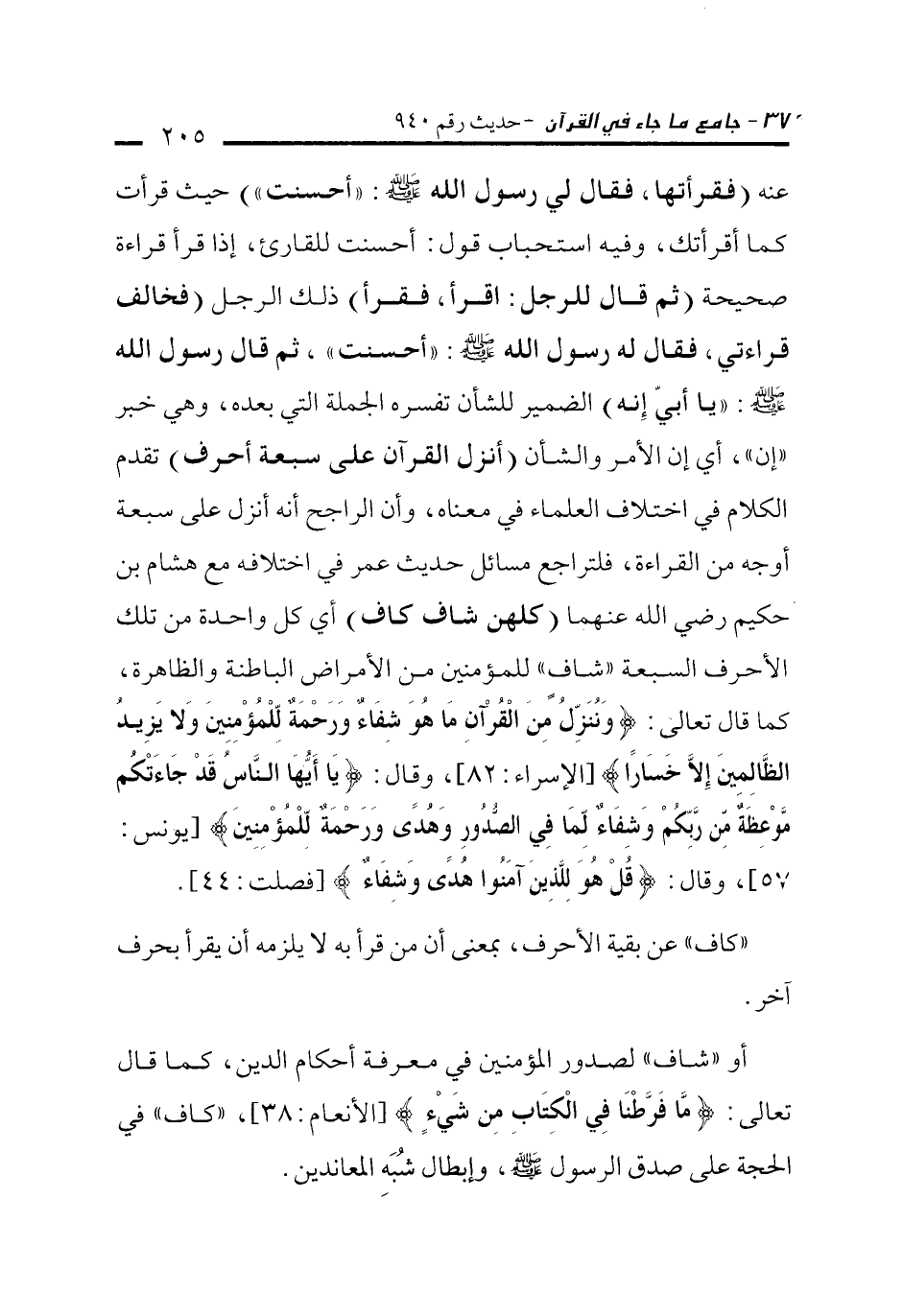 عنه (فقرأتها، فقال لي رسول الله - صلى الله عليه وسلم -: "أحسنت") حيث قرأت كما أقرأتك، وفيه استحباب قول: أحسنت للقارئ، إذا قرأ قراءة صحيحة (ثم قال للرجل: اقرأ، فقرأ) ذلك الرجل (فخالف قراءتي، فقال له رسول الله - صلى الله عليه وسلم -: "أحسنت"، ثم قال رسول الله - صلى الله عليه وسلم -: "يا أبيّ إِنه) الضمير لشأن تفسره الجملة التي بعده، وهي خبر "إن"، أي إن الأمر والشأن (أنزل القرآن على سبعة أحرف) تقدم الكلام في اختلاف العلماء في معناه، وأن الراجح أنه أنزل على سبعة أوجه من القراءة، فلتراجع مسائل حديث عمر في اختلافه هشام بن حكيم رضي الله عنهما (كلهن شاف كاف) أي كل واحدة من تلك الأحرف السبعة "شاف" للمؤمنين من الأمراض الباطنة والظاهرة، كما قال تعالى: {وَنُنَزِّلُ مِنَ الْقُرْآنِ مَا هُوَ شِفَاءٌ وَرَحْمَةٌ لِلْمُؤْمِنِينَ وَلَا يَزِيدُ الظَّالِمِينَ إِلَّا خَسَارًا} [الإسراء: 82]، وقال: {يَا أَيُّهَا النَّاسُ قَدْ جَاءَتْكُمْ مَوْعِظَةٌ مِنْ رَبِّكُمْ وَشِفَاءٌ لِمَا فِي الصُّدُورِ وَهُدًى وَرَحْمَةٌ لِلْمُؤْمِنِينَ} [يونس: 57]، وقال: {قُلْ هُوَ لِلَّذِينَ آمَنُوا هُدًى وَشِفَاءٌ} [فصلت: 44].