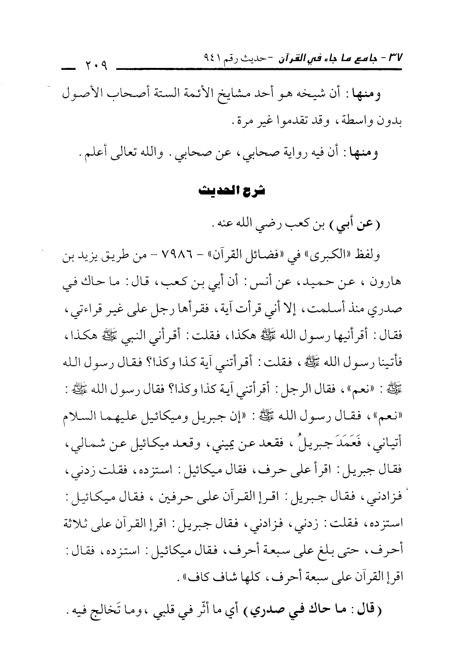 ولفظ "الكبرى" في "فضائل القرآن" -7986 - من طريق يزيد بن هارون، عن حميد، عن أنس: أن أبي بن كعب، قال: ما حاك في صدري منذ أسلمت، إلا أني قرأت آية، فقرأها رجل على غير قراءتي، فقال: أقرأنيها رسول الله - صلى الله عليه وسلم - هكذا، فقلت: أقرأني النبي - صلى الله عليه وسلم - هكذا، فأتينا رسول الله - صلى الله عليه وسلم -، فقلت: أقرأتني آية كذا وكذا؟ فقال رسول الله - صلى الله عليه وسلم -: "نعم"، فقال الرجل: أقرأتني آية كذا وكذا؟ فقال رسول الله - صلى الله عليه وسلم -: "نعم"، فقال رسول الله - صلى الله عليه وسلم -: "إن جبريل وميكائيل عليهما السلام أتياني، فَعَمَدَ جبريلُ، فقعد عن يميني، وقعد ميكائيل عن شمالي، فقال جبريل: اقرأ على حرف، فقال ميكائيل: استزده، فقلت زدني، فزادني، فقال جبريل: اقرأ القرآن على حرفين، فقال ميكائيل: استزده، فقلت: زدني، فزادني، فمال جبريل: اقرأ القرآن على ثلاثة أحرف، حتى بلغ على سبعة أحرف، فقال ميكائيل: استزده، فقال. اقرإ القرآن على سبعة أحرف، كلها شاف كاف".