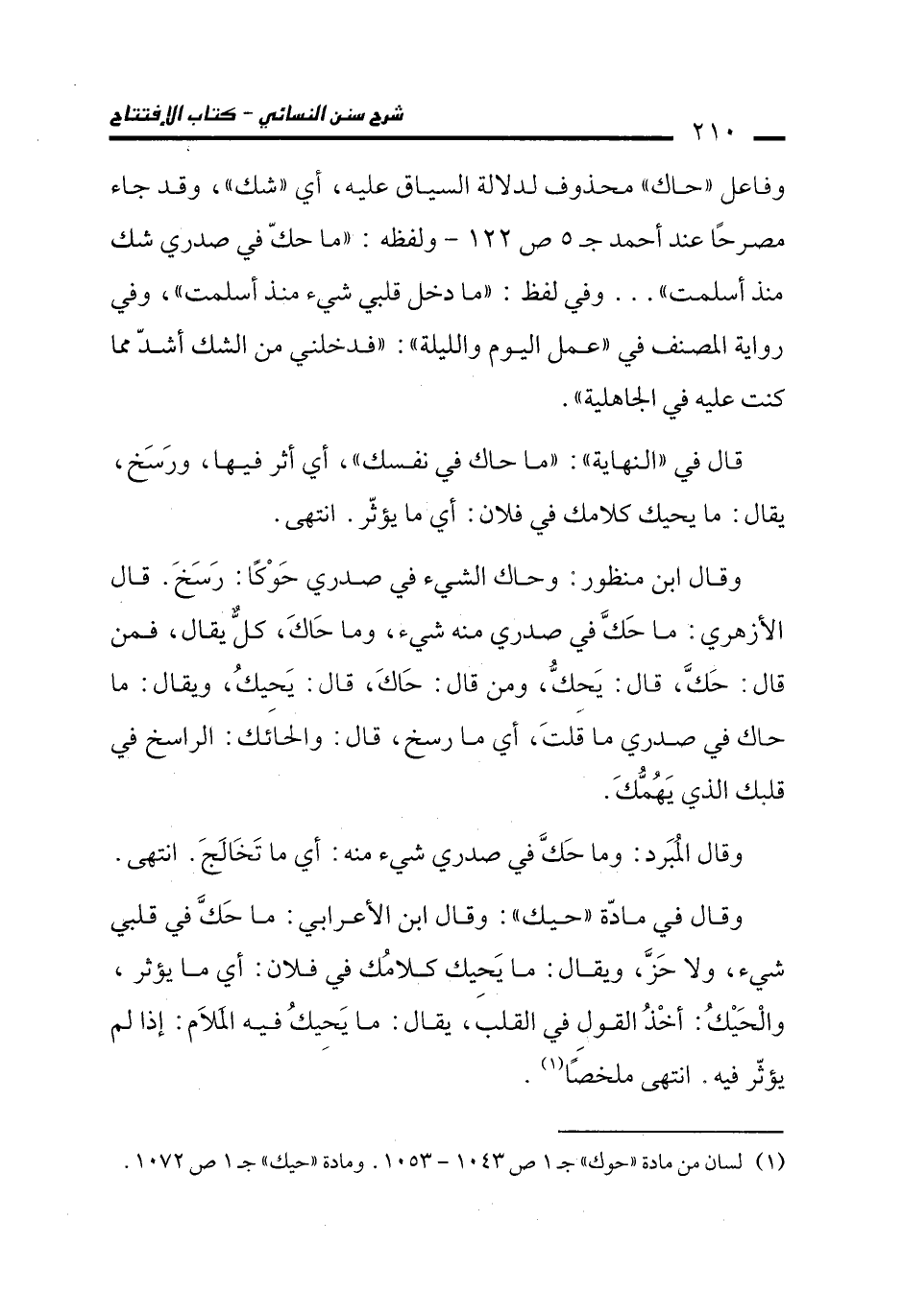 وقال في مادّة "حيك": وقال ابن الأعرابي: ما حَكَّ في قلبي شيء، ولا حَزَّ، ويقال: ما يَحِيك كلامُك في فلان: أي ما يؤثر، والْحَيْكُ: أخْذُ القولِ في القلب، يقال: ما يَحِيكُ فيه المَلاَم. إذا لم يؤثّر فيه. انتهى ملخصًا (¬1).
