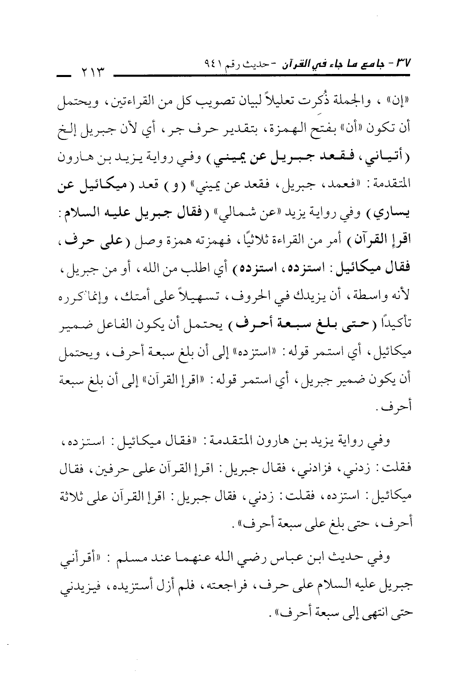وفي رواية يزيد بن هارون المتقدمة: "فقال ميكائيل: استزده، فقلت: زدني، فزادني، فقال جبريل: اقرإ القرآن على حرفين، فقال ميكائيل: استزده، فقلت: زدني، فقال جبريل: اقرإ القرآن على ثلاثة أحرف، حتى بلغ على سبعة أحرف".