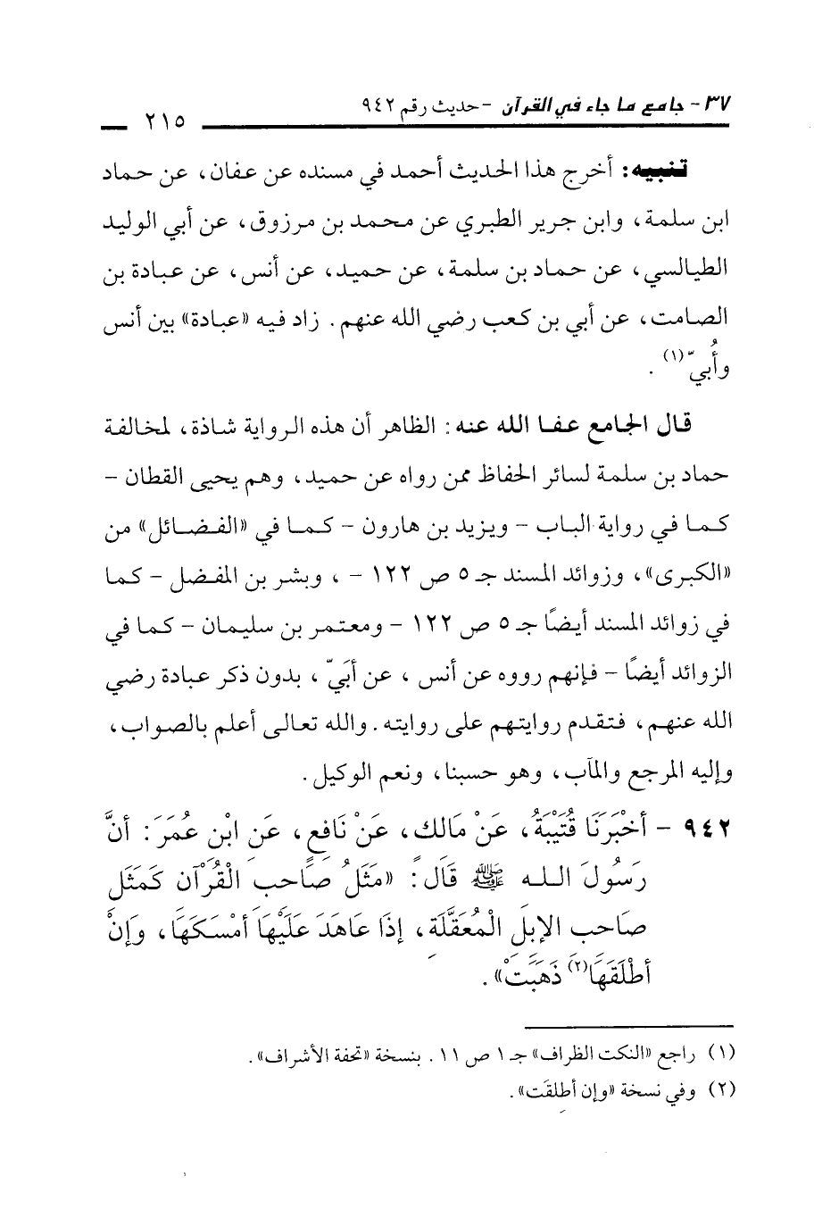 942 - أَخْبَرَنَا قُتَيْبَةُ، عَنْ مَالِكٍ، عَنْ نَافِعٍ، عَنِ ابْنِ عُمَرَ: أَنَّ رَسُولَ اللَّهِ - صلى الله عليه وسلم - قَالَ: "مَثَلُ صَاحِبِ الْقُرْآنِ كَمَثَلِ صَاحِبِ الإِبِلِ الْمُعَقَّلَةِ، إِذَا عَاهَدَ عَلَيْهَا أَمْسَكَهَا، وَإِنْ أَطْلَقَهَا (¬2) ذَهَبَتْ".