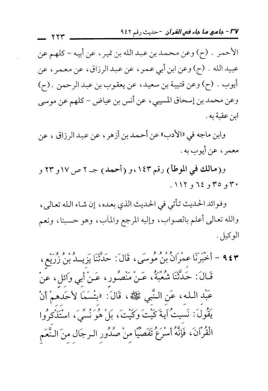 943 - أَخْبَرَنَا عِمْرَانُ بْنُ مُوسَى، قَالَ: حَدَّثَنَا يَزِيدُ بْنُ زُرَيْعٍ، قَالَ: حَدَّثَنَا شُعْبَةُ، عَنْ مَنْصُورٍ، عَنْ أَبِي وَائِلٍ، عَنْ عَبْدِ اللَّهِ، عَنِ النَّبِيِّ - صلى الله عليه وسلم -، قَالَ: "بِئْسَمَا لأَحَدِهِمْ أَنْ يَقُولَ: نَسِيتُ آيَةَ كَيْتَ وَكَيْتَ، بَلْ هُوَ نُسِّيَ، اسْتَذْكِرُوا الْقُرْآنَ، فَإِنَّهُ أَسْرَعُ تَفَصِّيًا مِنْ صُدُورِ الرِّجَالِ مِنَ النَّعَمِ