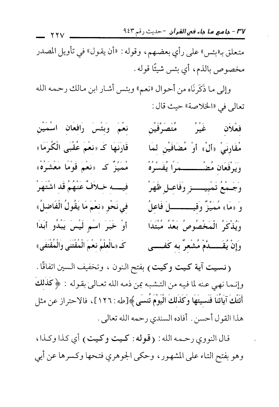 (نسيت آية كيت وكيت) بفتح النون، وتخفيف السين اتفاقًا. وإنما نهي عنه لما فيه من التشبه بمن ذمه الله تعالى بقوله: {كَذَلِكَ أَتَتْكَ آيَاتُنَا فَنَسِيتَهَا وَكَذَلِكَ الْيَوْمَ تُنْسَى} [طه: 126]، فالاحتراز عن مثل هذا القول أحسن. أفاده السندي رحمه الله تعالى.