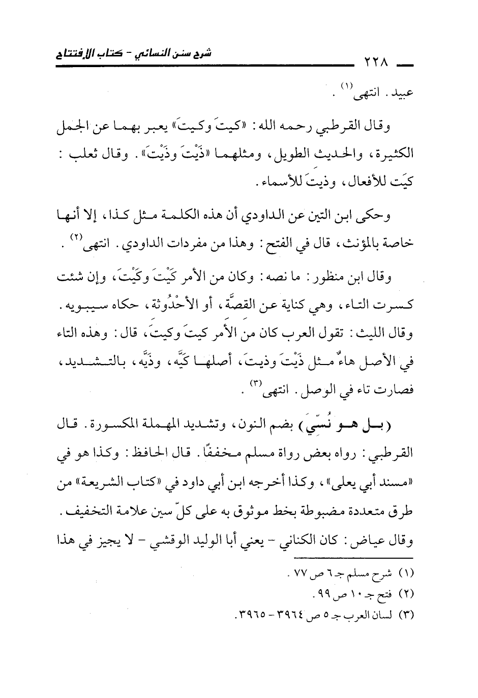 وقال ابن منظور: ما نصه: وكان من الأمر كَيْتَ وكَيْتَ، وإن شئت كسرت التاء، وهي كناية عن القِصَّةِ، أو الأحْدُوثةِ، حكاه سيبويه. وقال الليث: تقول العرب كان منَ الأَمر كيتَ وكيتَ، قال. وهذه التاء في الأصل هاءٌ مثل ذَيْتَ وذيتَ، أصلها كَيَّه، وذَيَّه، بالتشديد، فصارت تاء في الوصل. انتهى (¬3).