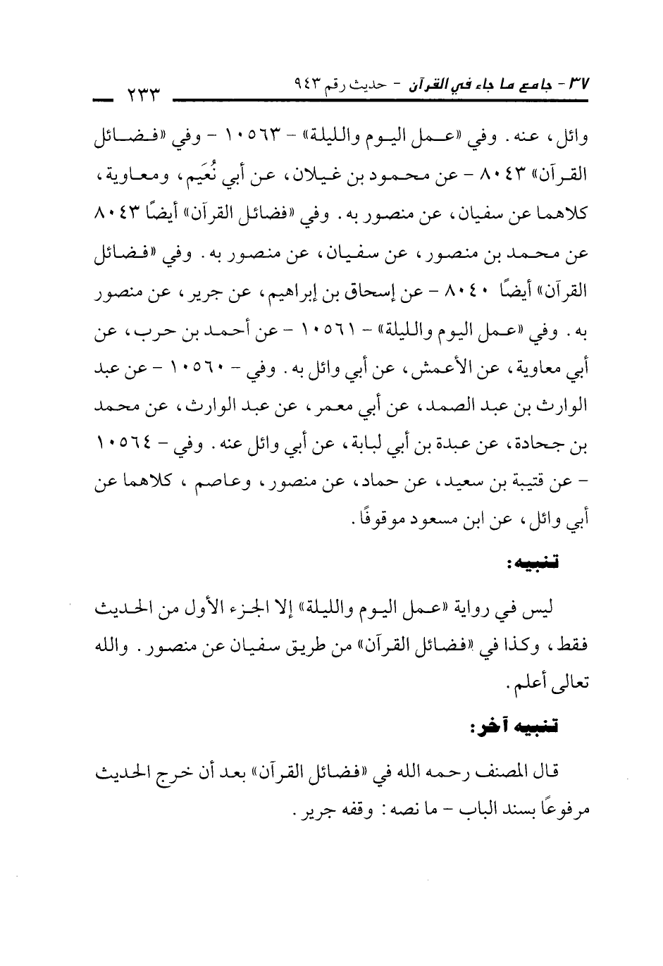 وائل، عنه. وفي "عمل اليوم والليلة" -10563 - وفي "فضائل القرآن" 8043 - عن محمود بن غيلان، عن أبي نُعَيم، ومعاوية، كلاهما عن سفيان، عن منصور به. وفي "فضائل القرآن" أيضًا 8043 عن محمد بن منصور، عن سفيان، عن منصور به. وفي "فضائل القرآن" أيضًا 8040 - عن إسحاق بن إبراهيم، عن جرير، عن منصور به. وفي "عمل اليوم والليلة" -10561 - عن أحمد بن حرب، عن أبي معاوية، عن الأعمش، عن أبي وائل به. وفي -10560 - عن عبد الوارث بن عبد الصمد، عن أبي معمر، عن عبد الوارث، عن محمد بن جحادة، عن عبدة بن أبي لبابة، عن أبي وائل عنه. وفي -10564 - عن قتيبة بن سعيد، عن حماد، عن منصور، وعاصم، كلاهما عن أبي وائل، عن ابن مسعود موقوفًا.
