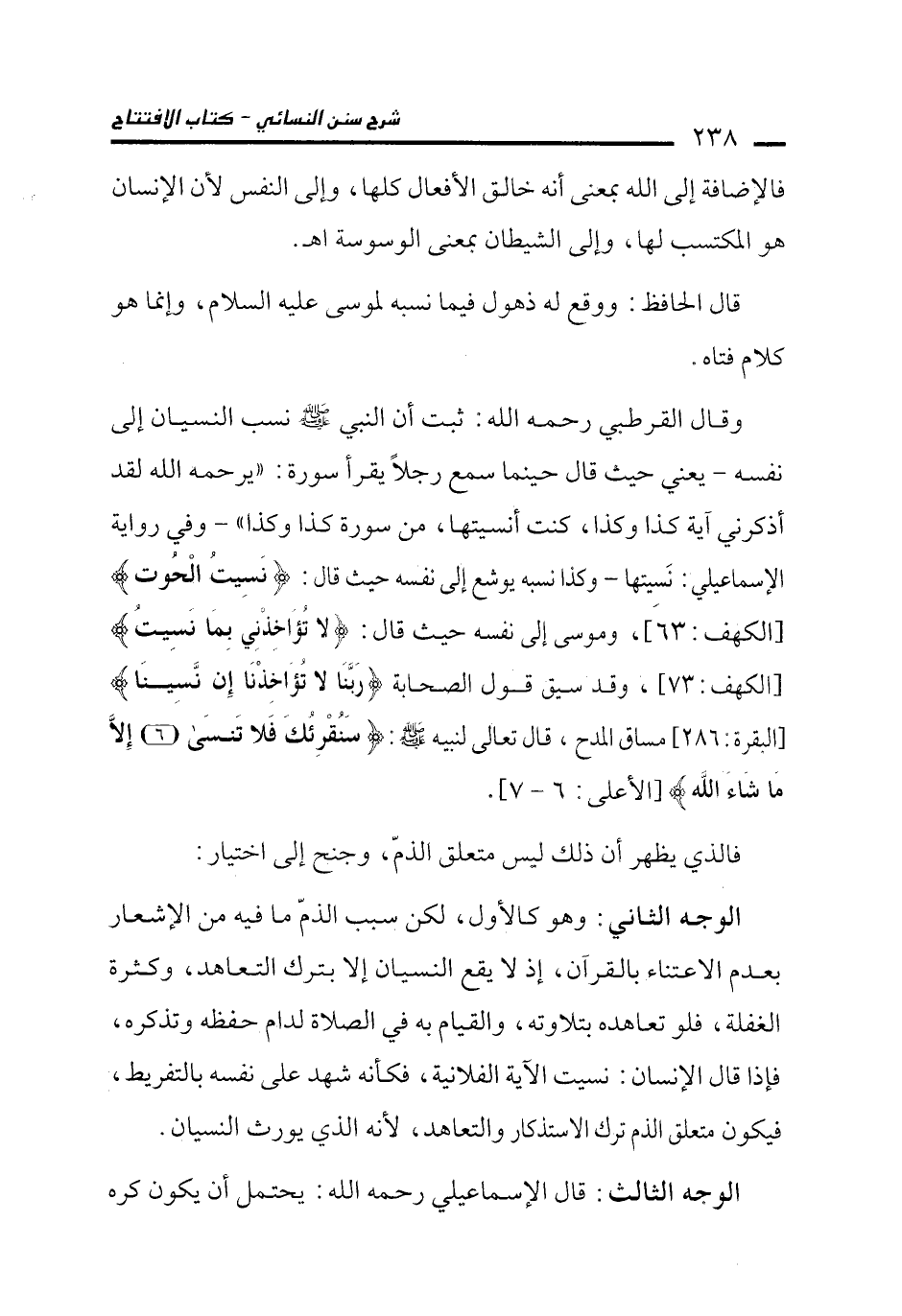 وقال القرطبي رحمه الله: ثبت أن النبي - صلى الله عليه وسلم - نسب النسيان إلى نفسه -يعني حيث قال حينما سمع رجلًا يقرأ سورة: "يرحمه الله لقد أذكرني آية كذا وكذا، كثت أنسيتها، من سورة كذا وكذا"- وفي رواية الإسماعيلي: نَسِيتها- وكذا نسبه يوشع إلى نفسه حيث قال: {نَسِيتُ الْحُوتَ} [الكهف: 63]، وموسى إلى نفسه حيث قال: {لَا تُؤَاخِذْنِي بِمَا نَسِيتُ} [الكهف: 63] , وقد سيق قول الصحابة {رَبَّنَا لَا تُؤَاخِذْنَا إِنْ نَسِينَا} [البقرة: 286] مساق المدح، قال تعالى لنبيه - صلى الله عليه وسلم -: {سَنُقْرِئُكَ فَلَا تَنْسَى (6) إِلَّا مَا شَاءَ اللَّهُ} [الأعلى: 6 - 7].