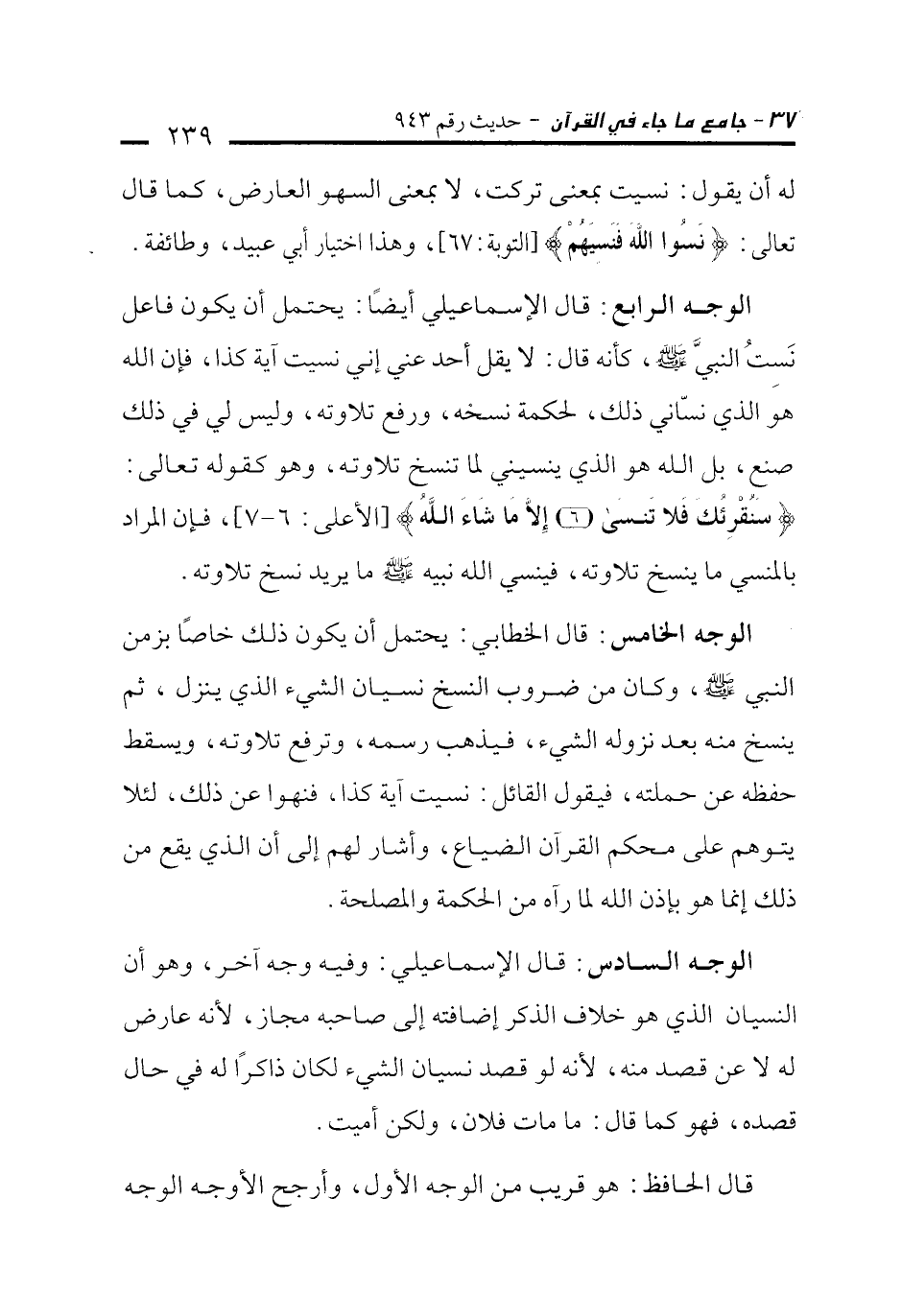 الوجه الرابع: قال الإسماعيلي أيضًا: يحتمل أن يكون فاعل نَسِت النبيَّ - صلى الله عليه وسلم -، كأنه قال: لا يقل أحد عني إني نسيت آية كذا، فإن الله هوَ الذي نسّاني ذلك، لحكمة نسخه، ورفع تلاوته، وليس لي في ذلك صنع، بل الله هو الذي ينسيني لما تنسخ تلاوته، وهو كقوله تعالى: {سَنُقْرِئُكَ فَلَا تَنْسَى (6) إِلَّا مَا شَاءَ اللَّهُ} [الأعلى: 6 - 7]، فإن المراد بالمنسي ما ينسخ تلاوته، فينسي الله نبيه - صلى الله عليه وسلم - ما يريد نسخ تلاوته.