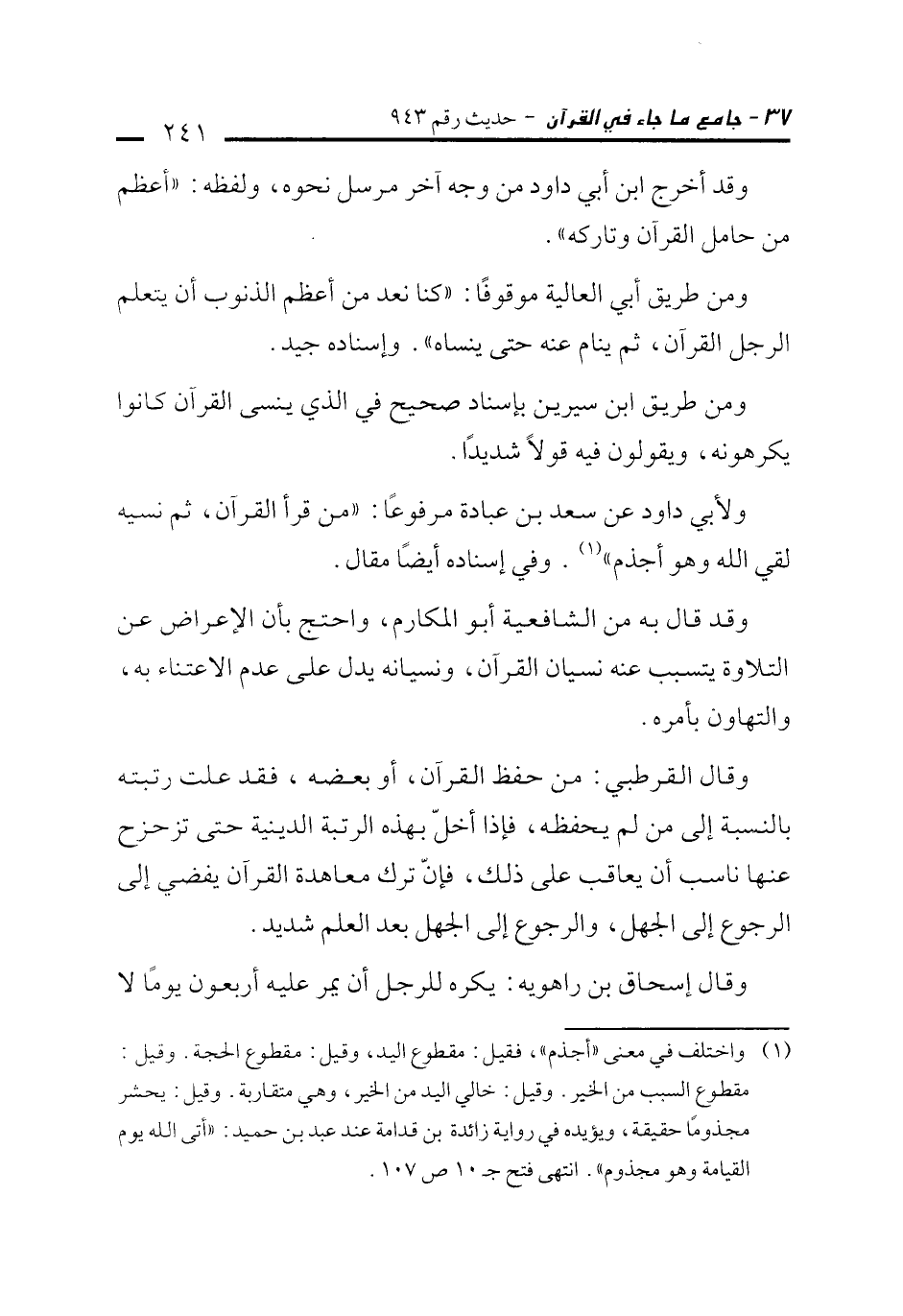 ومن طريق أبي العالية موقوفًا: "كنا نعد من أعظم الذنوب أن يتعلم الرجل القرآن، ثم ينام عنه حتى ينساه". وإسناده جيد.