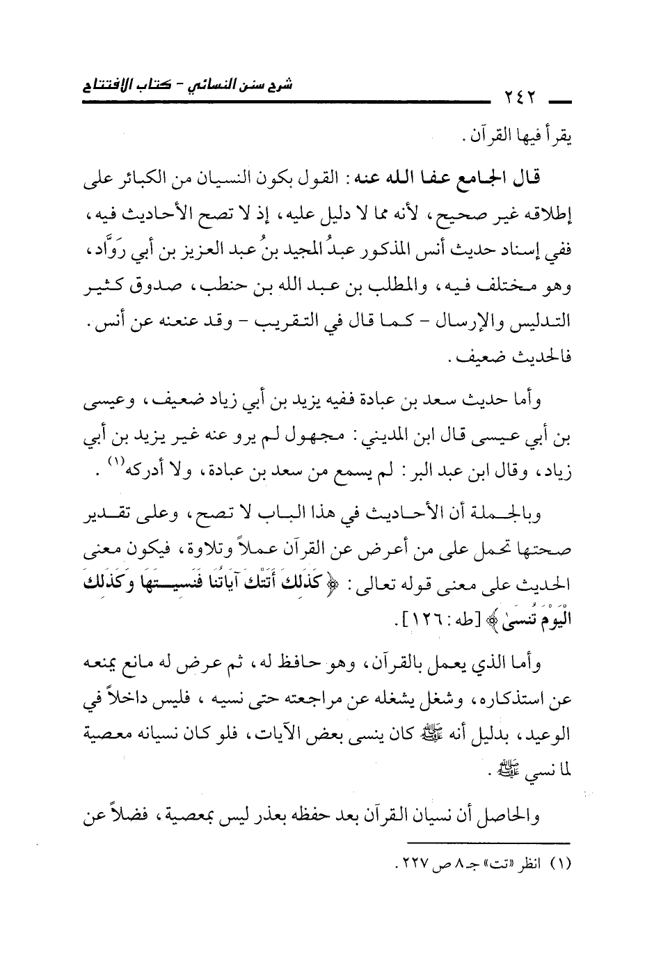 قال الجامع عفا الله عنه: القول بكون النسيان من الكبائر على إطلاقه غير صحيح, لأنه مما لا دليل عليه، إذ لا تصح الأحاديث فيه، ففي إسناد حديث أنس المذكور عبدُ المجيد بنُ عبد العزيز بن أبي رَوَّاد، وهو مختلف فيه، والمطلب بن عبد الله بن حنطب، صدوق كثير التدليس والإرسال -كما قال في التقريب- وقد عنعنه عن أنس. فالحديث ضعيف.