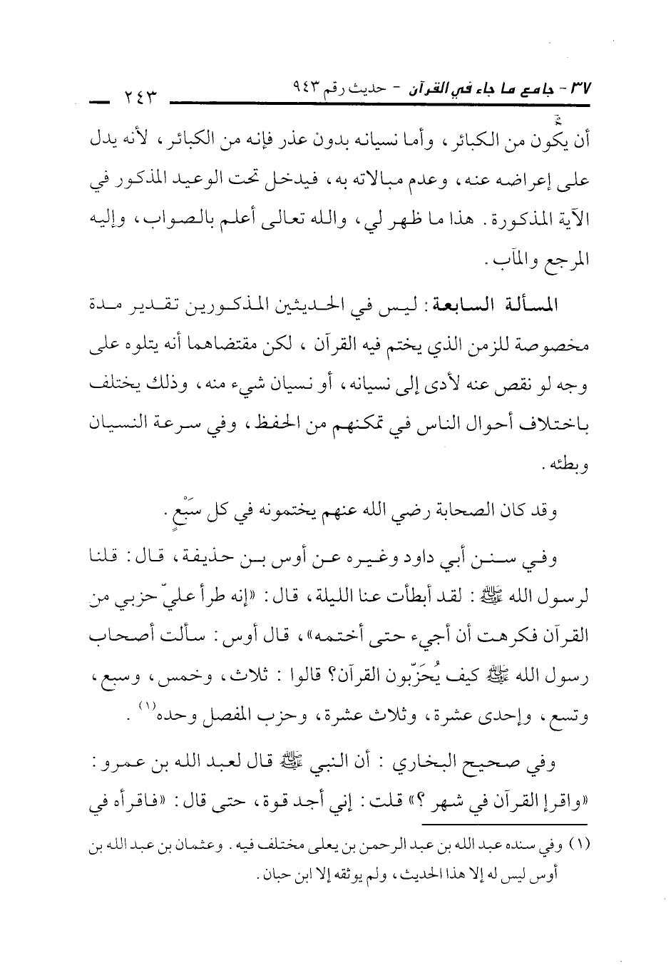 المسألة السابعة: ليس في الحديثين المذكورين تقدير مدة مخصوصة للزمن الذي يختم فيه القرآن، لكن مقتضاهما أنه يتلوه على