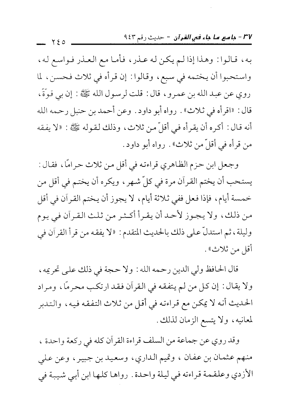 قال الحافظ ولي الدين رحمه الله: ولا حجة في ذلك على تحريمه، ولا يقال: إن كل من لم يتفقه في القرآن فقد ارتكب محرمًا، ومراد الحديث أنه لا يمكن مع قراءته في أقل من ثلاث التفقه فيه، والتدبر لمعانيه، ولا يتسع الزمان لذلك.