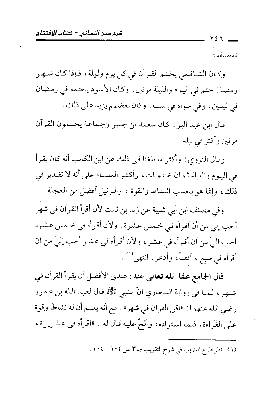 قال الجامع عفا الله تعالى عنه: عندي الأفضل أن يقرأ القرآن في شهر، لما في رواية البخاري أنّ النبي - صلى الله عليه وسلم - قال لعبد الله بن عمرو رضي الله عنهما: "اقرإ القرآن في شهر". مع أنه يعلم أن له نشاطًا وقوة على القراءة، فلما استزاده، وألحّ عليه قال له: "اقرأه في عشرين"،