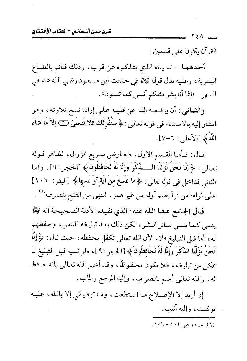 قال: فأما القسم الأول، فعارض سريع الزوال، لظاهر قوله تعالى: {إِنَّا نَحْنُ نَزَّلْنَا الذِّكْرَ وَإِنَّا لَهُ لَحَافِظُونَ} [الحجر: 9]. وأما الثاني فداخل في قول تعالى: {مَا نَنْسَخْ مِنْ آيَةٍ أَوْ نُنْسِهَا} [البقرة: 106] على قراءة من قرأ بضم أوله من غير همز. انتهى من الفتح بتصرف (¬1).