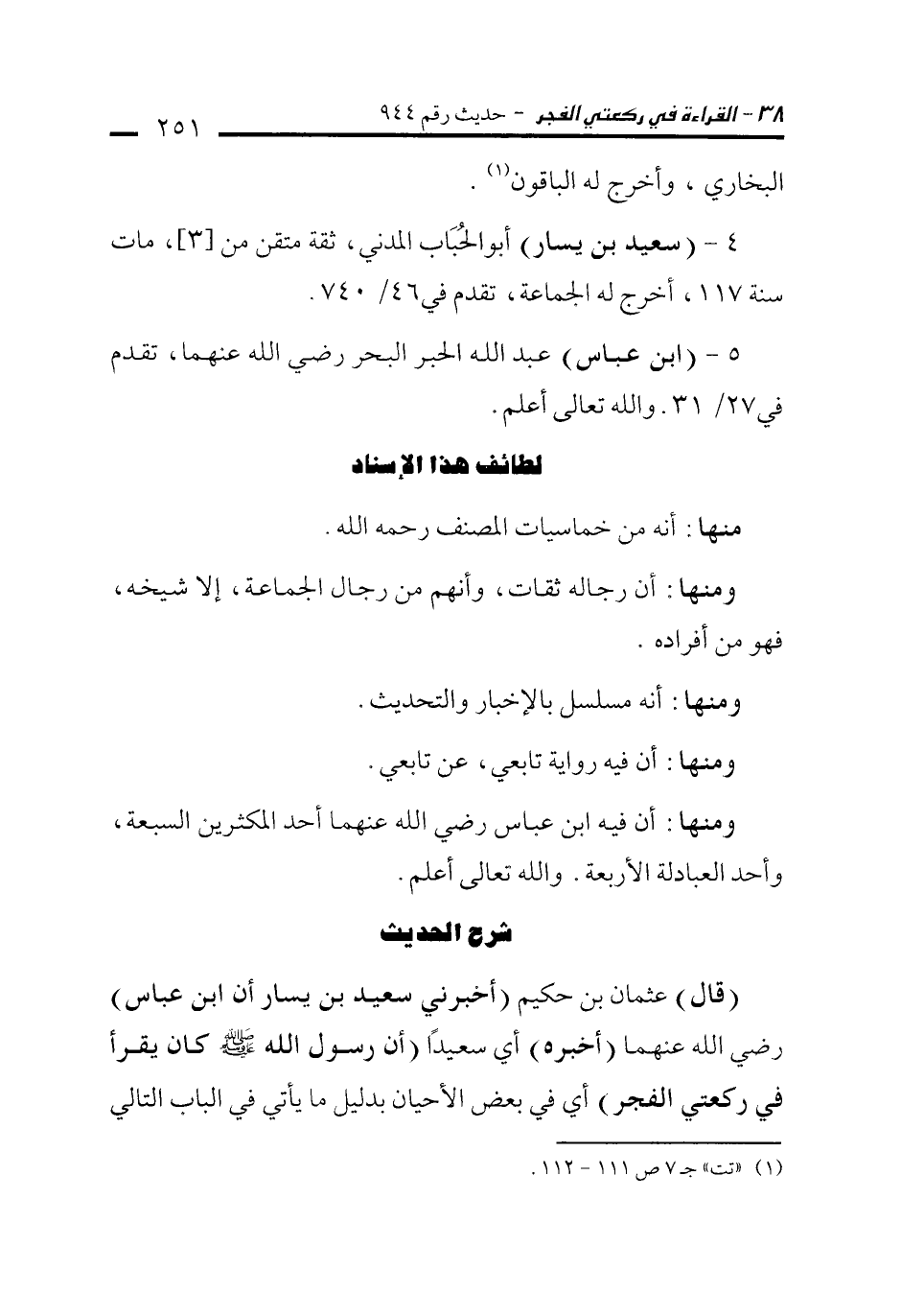 (قال) عثمان بن حكيم (أخبرني سعيد بن يسار أن ابن عباس) رضي الله عنهما (أخبره) أي سعيدًا (أن رسول الله - صلى الله عليه وسلم - كان يقرأ في ركعتي الفجر) أي في بعض الأحيان بدليل ما يأتي في الباب التالي