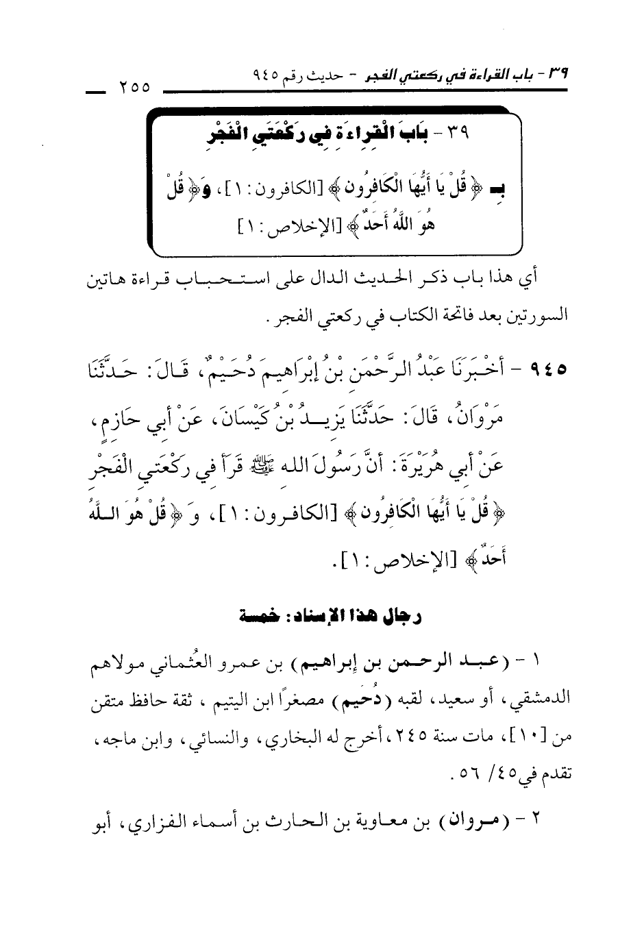 945 - أَخْبَرَنَا عَبْدُ الرَّحْمَنِ بْنُ إِبْرَاهِيمَ دُحَيْمٌ، قَالَ: حَدَّثَنَا مَرْوَانُ، قَالَ: حَدَّثَنَا يَزِيدُ بْنُ كَيْسَانَ، عَنْ أَبِي حَازِمٍ، عَنْ أَبِي هُرَيْرَةَ: أَنَّ رَسُولَ اللَّهِ - صلى الله عليه وسلم - قَرَأَ فِي رَكْعَتَيِ الْفَجْرِ {قُلْ يَا أَيُّهَا الْكَافِرُونَ} [الكافرون: 1]، وَ {قُلْ هُوَ اللَّهُ أَحَدٌ} [الإخلاص: 1].