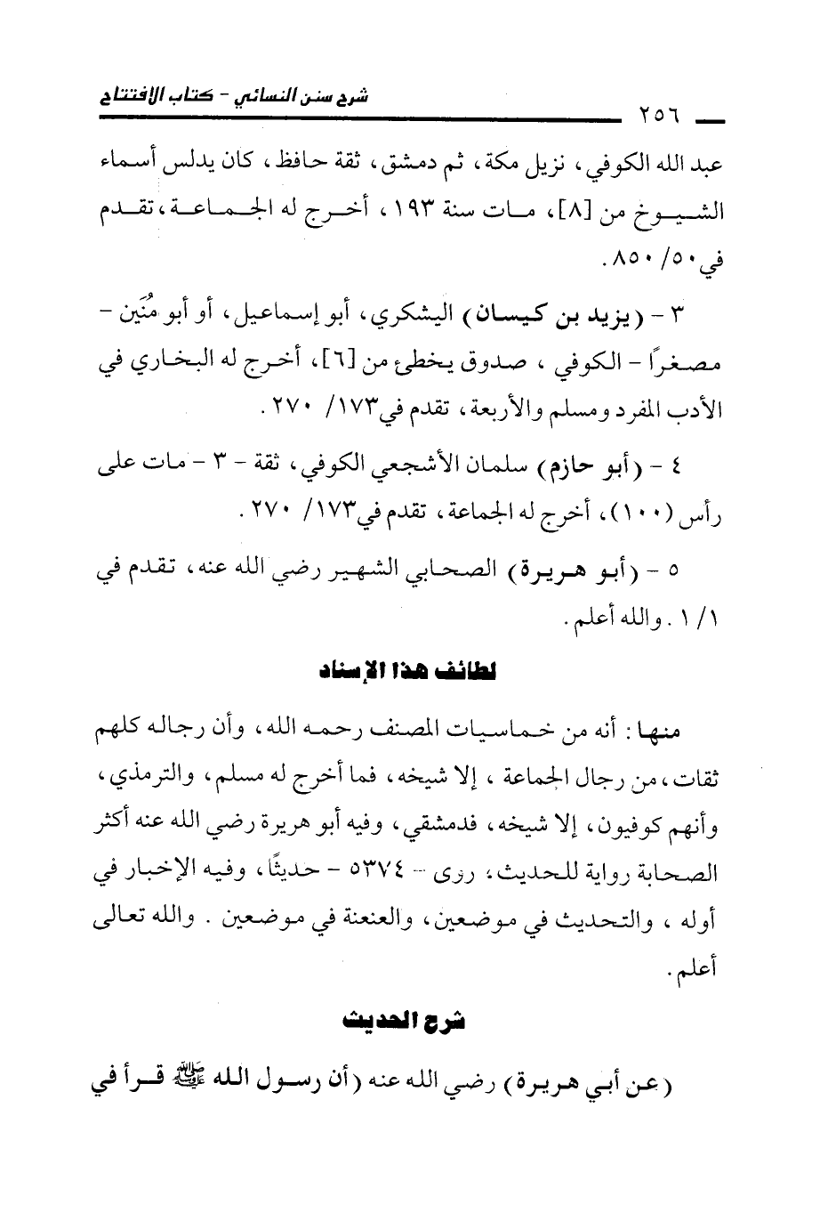 منها: أنه من خماسيات المصنف رحمه الله، وأن رجاله كلهم ثقات، من رجال الجماعة، إلا شيخه، فما أخرج له مسلم، والترمذي، وأنهم كوفيون، إلا شيخه، فدمشقي، وفيه أبو هريرة رضي الله عنه أكثر الصحابة رواية للحديث, روى -5374 - حديثًا، وفيه الإخبار في أوله، والتحديث في موضعين، والعنعنة في موضعين. والله تعالى أعلم.