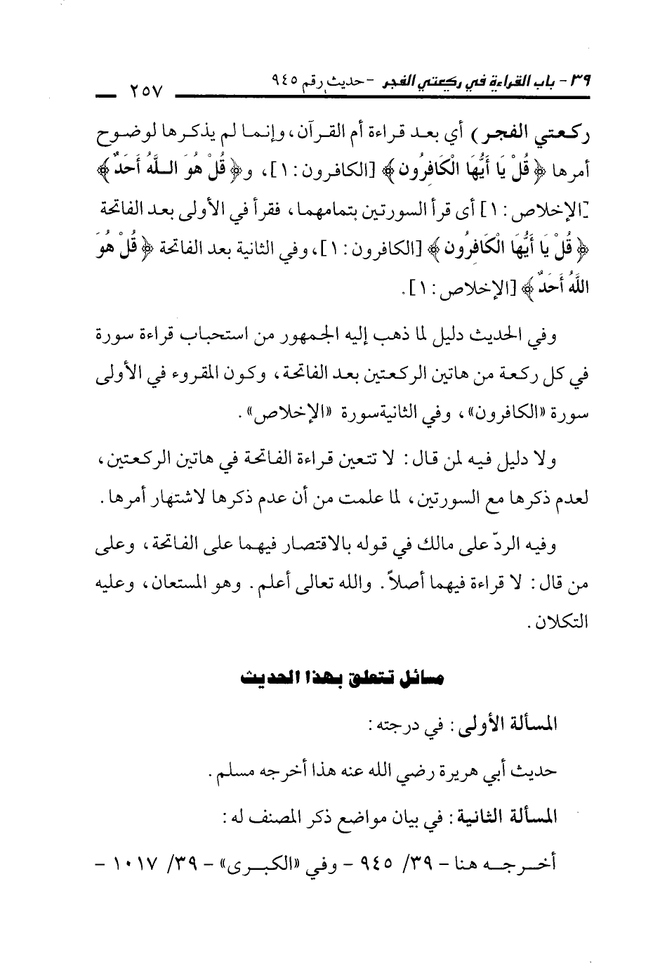 وفي الحديث دليل لما ذهب إليه الجمهور من استحباب قراءة سورة في كل ركعة من هاتين الركعتين بعد الفاتحة، وكون المقروء في الأولى سورة "الكافرون"، وفي الثانية سورة "الإخلاص".