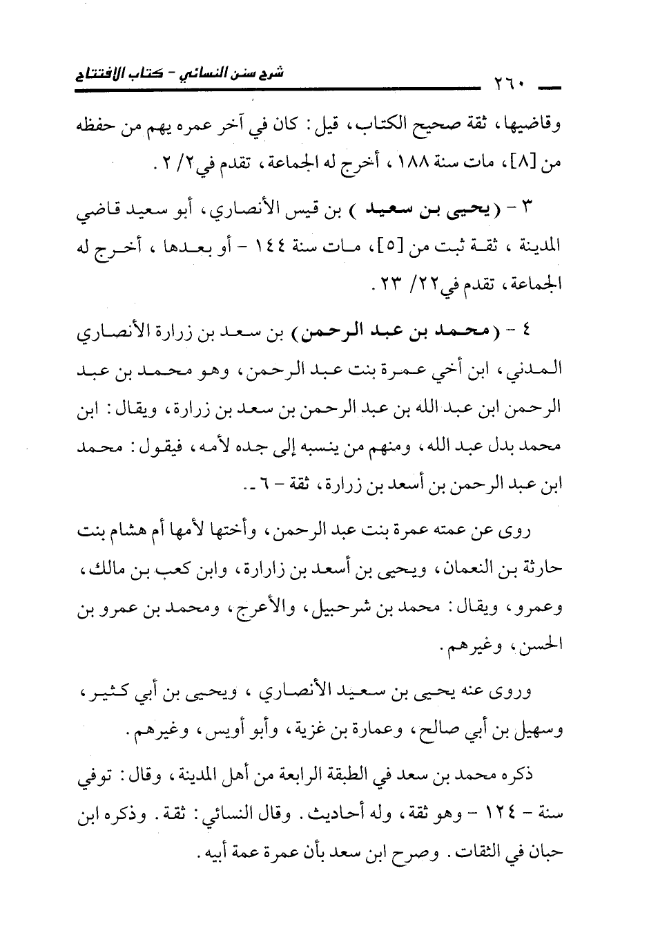 4 - (محمد بن عبد الرحمن) بن سعد بن زرارة الأنصاري المدني، ابن أخي عمرة بنت عبد الرحمن، وهو محمد بن عبد الرحمن ابن عبد الله بن عبد الرحمن بن سعد بن زرارة، ويقال: ابن محمد بدل عبد الله، ومنهم من ينسبه إلى جده لأمه، فيقول: محمد