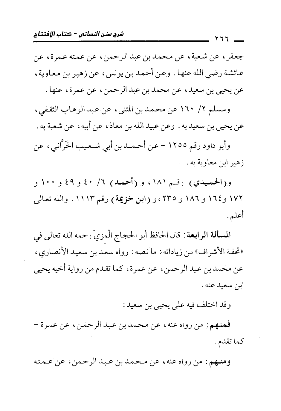 المسألة الرابعة: قال الحافظ أبو الحجاج الْمِزيّ رحمه الله تعالى في "تحفة الأشراف" من زياداته.: ما نصه: رواه سعد بن سعيد الأنصاري، عن محمد بن عبد الرحمن، من عمرة، كما تقدم من رواية أخيه يحيى ابن سعيد عنه.