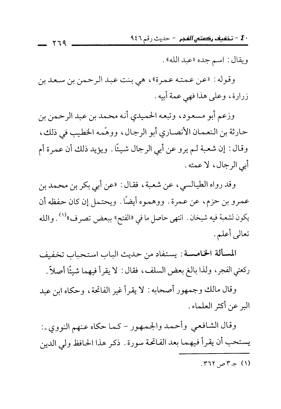 المسألة الخامسة: يستفاد من حديث الباب استحباب تخفيف ركعتي الفجر, ولذا بالغ بعض السلف، فقال: لا يقرأ فيهما شيئًا أصلًا.