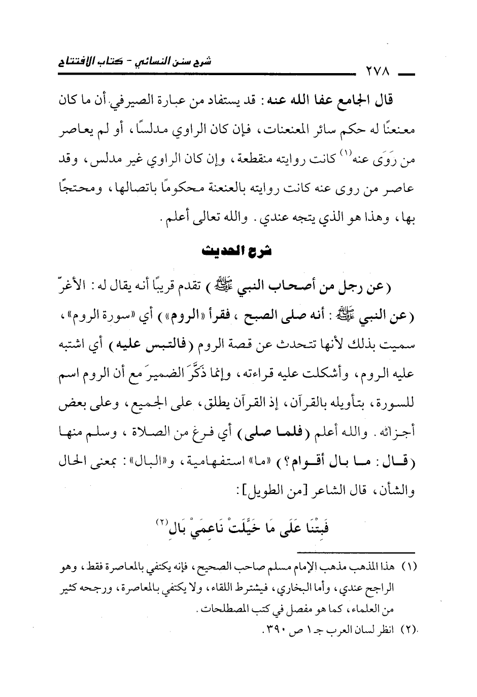 قال الجامع عفا الله عنه: قد يستفاد من عبارة الصيرفي. أن ما كان معنعنًا له حكم سائر المعنعنات، فإن كان الراوي مدلسًا، أو لم يعاصر من رَوَى عنه (¬1) كانت روايته منقطعة، وإن كان الراوي غير مدلس، وقد عاصر من روى عنه كانت روايته بالعنعة محكومًا باتصالها، ومحتجًا بها، وهذا هو الذي يتجه عني. والله تعالى أعلم.