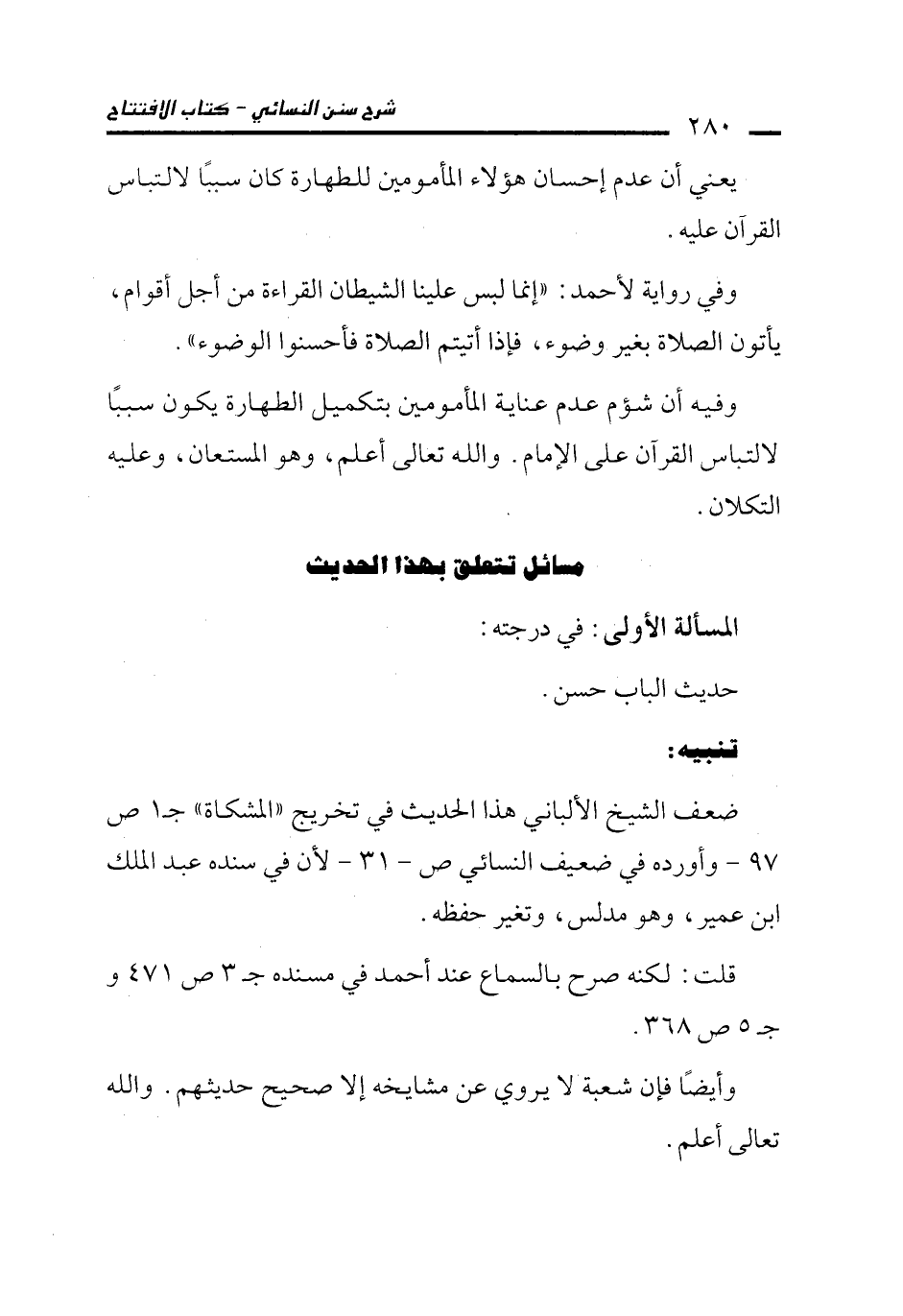 وفيه أن شؤم عدم عناية المأمومين بتكميل الطهارة يكون سببًا لالتباس القرآن على الإمام. والله تعالى أعلم، وهو المستعان، وعليه