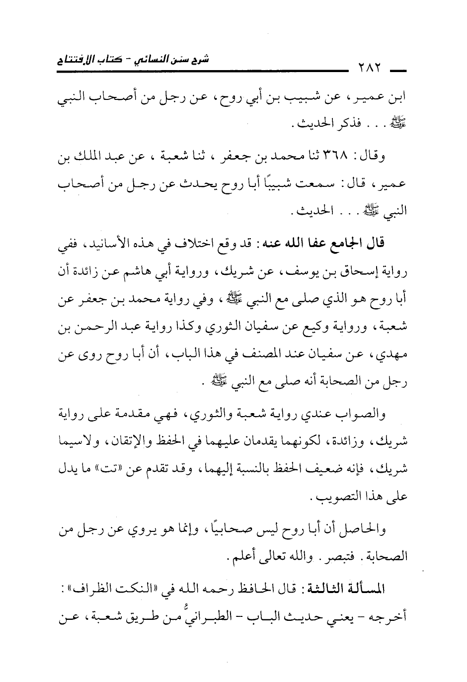 قال الجامع عفا الله عنه: قد وقع اختلاف في هذه الأسانيد، ففي رواية إسحاق بن يوسف، عن شريك، ورواية أبي هاشم عن زائدة أن أبا روح هو الذي صلى مع النبي - صلى الله عليه وسلم -، وفي رواية محمد بن جعفر عن شعبة، ورواية وكيع عن سفيان الثوري وكذا رواية عبد الرحمن بن مهدي، عن سفيان عند المصنف في هذا الباب، أن أبا روح روى عن رجل من الصحابة أنه صلى مع النبي - صلى الله عليه وسلم -.