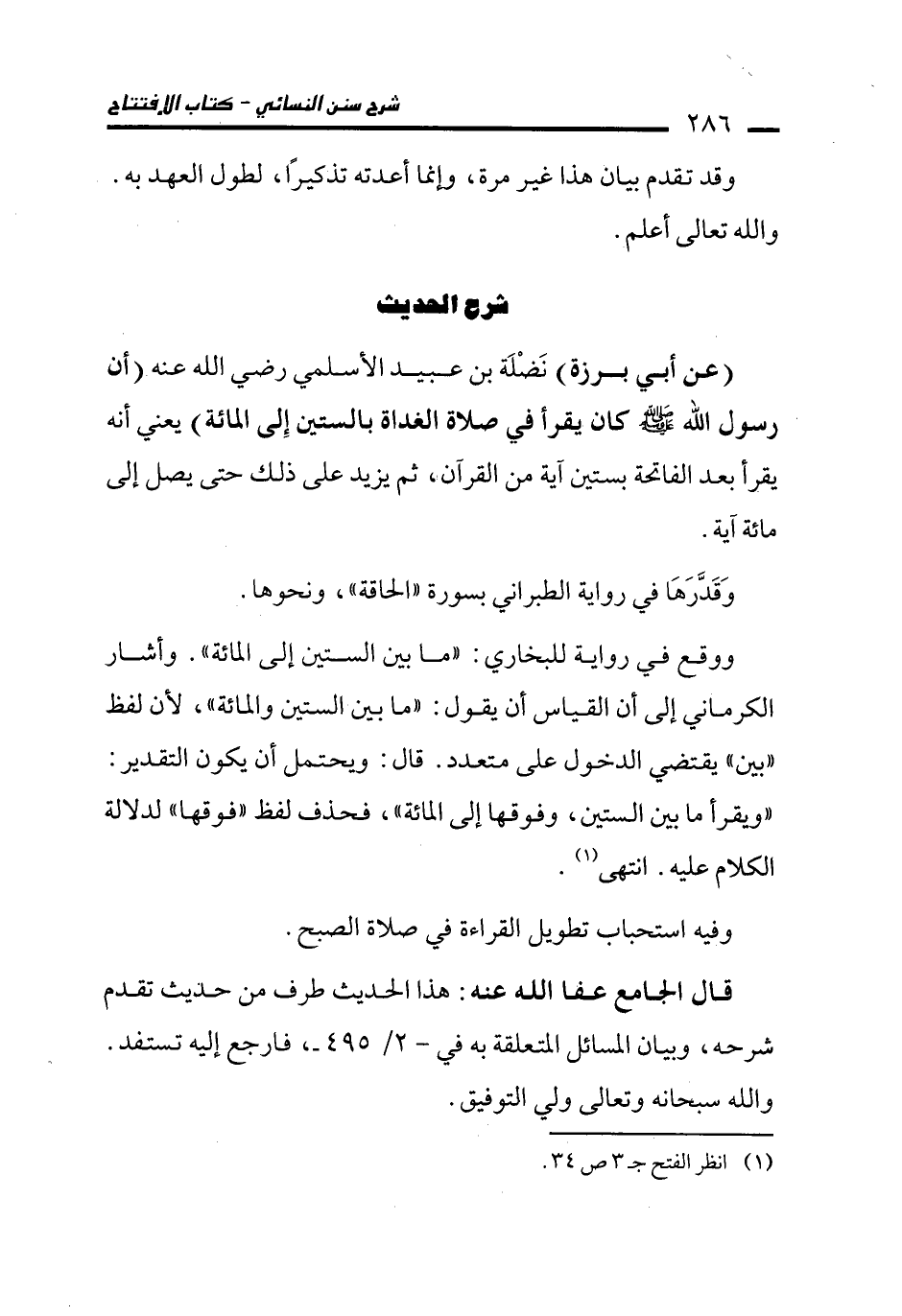 (عن أبي برزة) نَضْلَة بن عبيد الأسلمي رضي الله عنه (أن رسول الله - صلى الله عليه وسلم - كان يقرأ في صلاة الغداة بالستين إِلى المائة) يعني أنه يقرأ بعد الفاتحة بستين آية من القرآن، ثم يزيد على ذلك حتى يصل إلى مائة آية.