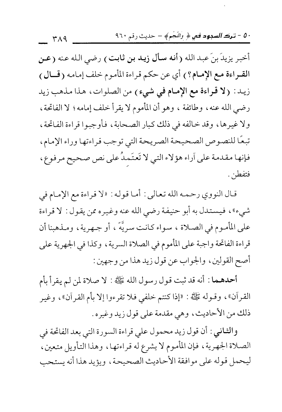 أحدهما: أنه قد ثبت قول رسول الله - صلى الله عليه وسلم -: لا صلاة لمن لم يقرأ بأم القرآن"، وقوله - صلى الله عليه وسلم -: "إذا كنتم خلفي فلا تقرءوا إلا بأم القرآن"، وغير ذلك من الأحاديث، وهي مقدمة على قول زيد وغيره.