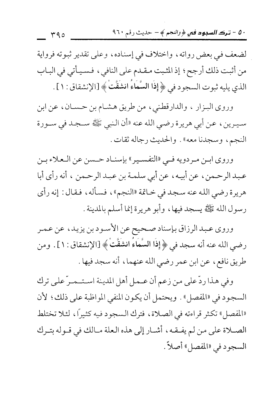 لضعف في بعض رواته، واختلاف في إسناده، وعلى تقدير ثبوته فرواية من أثبت ذلك أرجح؛ إذ المثبت مقدم على النافي، فسيأتي في الباب الذي يليه ثبوت السجود في {إِذَا السَّمَاءُ انْشَقَّتْ} [الانشقاق: 1].