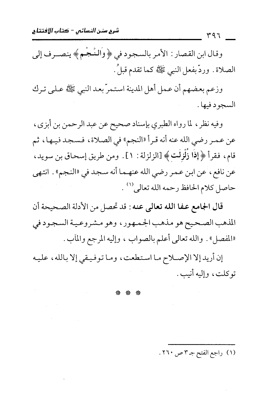 وفيه نظر، لما رواه الطبري بإسناد صحيح عن عبد الرحمن بن أبزى، عن عمر رضي الله عنه أنه قرأ "النجم" في الصلاة، فسجد فيها، ثم قام، فقرأ {إِذَا زُلْزِلَتِ} [الزلزلة: 1]. ومن طريق إسحاق بن سويد، عن نافع، عن ابن عمر رضي الله عنهما أنه سجد في "النجم". انتهى حاصل كلام الحافظ رحمه الله تعالى (¬1).