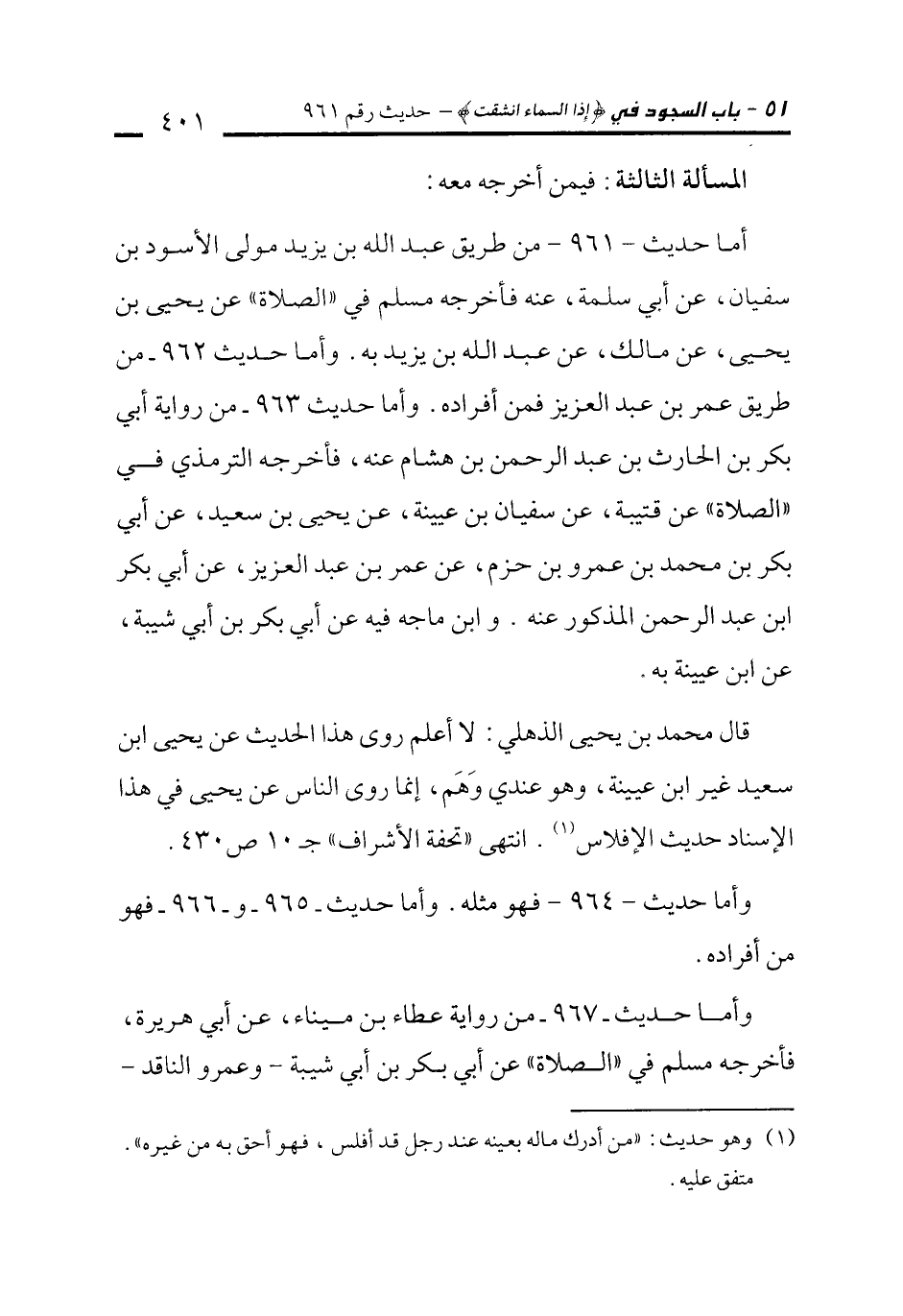 أما حديث -961 - من طريق عبد الله بن يزيد مولى الأسود بن سفيان، عن أبي سلمة، عنه فأخرجه مسلم في "الصلاة" عن يحيى بن يحيى، عن مالك، عن عبد الله بن يزيد به. وأما حديث 962 - من طريق عمر بن عبد العزيز فمن أفراده. وأما حديث 963 - من رواية أبي بكر بن الحارث بن عبد الرحمن بن هشام عنه، فأخرجه الترمذي في "الصلاة" عن قتيبة، عن سفيان بن عيينة، عن يحيى بن سعيد، عن أبي بكر بن محمد بن عمرو بن حزم، عن عمر بن عبد العزيز، عن أبي بكر ابن عبد الرحمن المذكور عنه. وابن ماجه فيه عن أبي بكر بن أبي شيبة، عن ابن عيينة به.