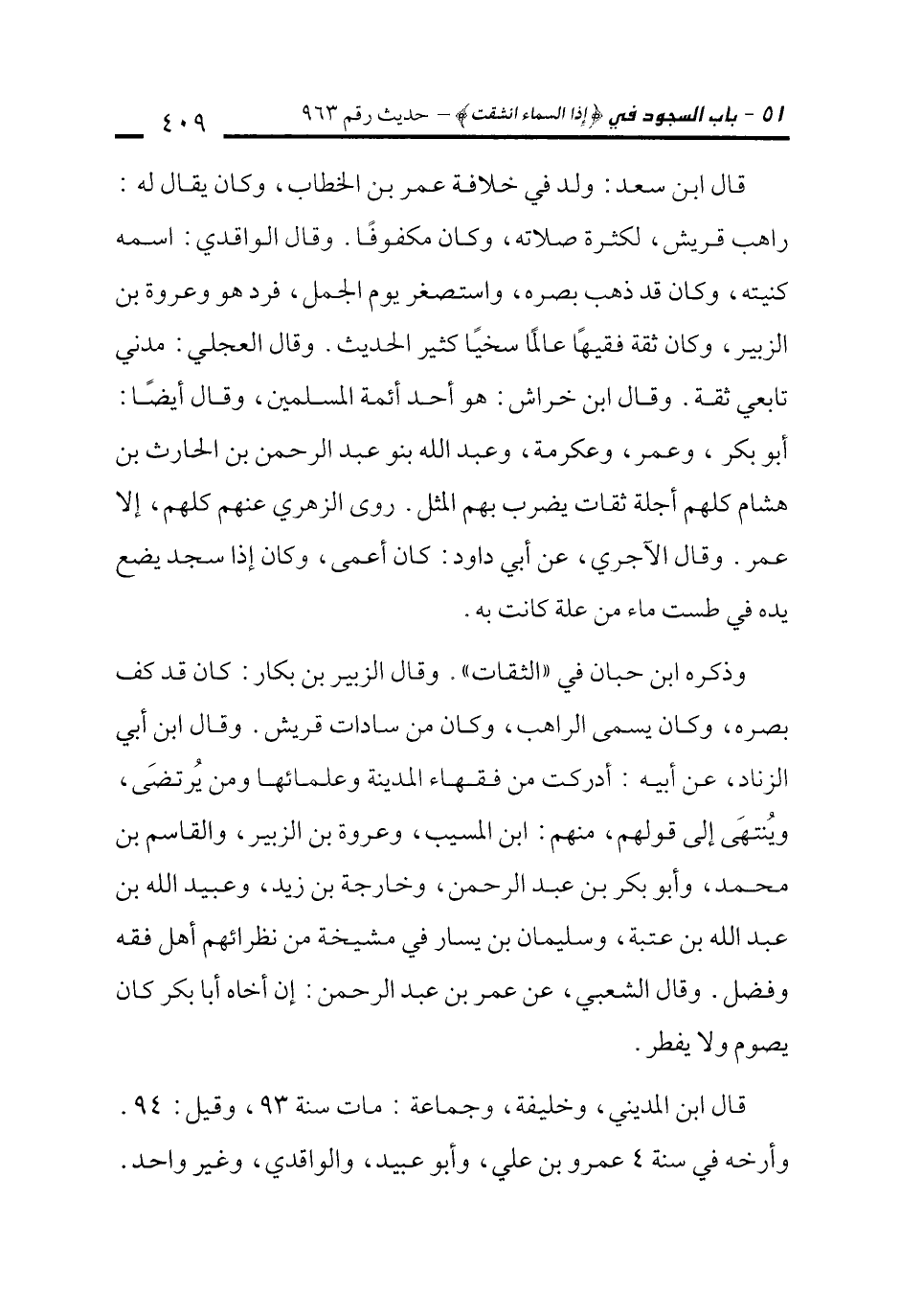 وذكره ابن حبان في "الثقات". وقال الزبير بن بكار: كان قد كف بصره، وكان يسمى الراهب، وكان من سادات قريش. وقال ابن أبي الزناد، عن أبيه: أدركت من فقهاء المدينة وعلمائها ومن يُرتضَى، ويُنتهَى إلى قولهم، منهم: ابن المسيب، وعروة بن الزبير، والقاسم بن محمد، وأبو بكر بن عبد الرحمن، وخارجة بن زيد، وعبيد الله بن عبد الله بن عتبة، وسليمان بن يسار في مشيخة من نظرائهم أهل فقه وفضل. وقال الشعبي، عن عمر بن عبد الرحمن: إن أخاه أبا بكر كان يصوم ولا يفطر.