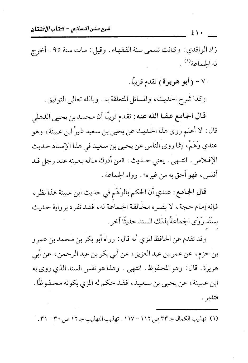 قال الجامع عفا الله عنه: تقدم قريبًا أن محمد بن يحيى الذهلي قال: لا أعلم روى هذا الحديث عن يحيى بن سعيد غيرُ ابن عيينة، وهو عندي وَهَمٌ، إنما روى الناس عن يحيى بن سعيد في هذا الإسناد حديث الإفلاس. انتهى. يعني حديث: "من أدرك ماله بعينه عند رجل قد أفلس، فهو أحق به من غيره". رواه الجماعة.