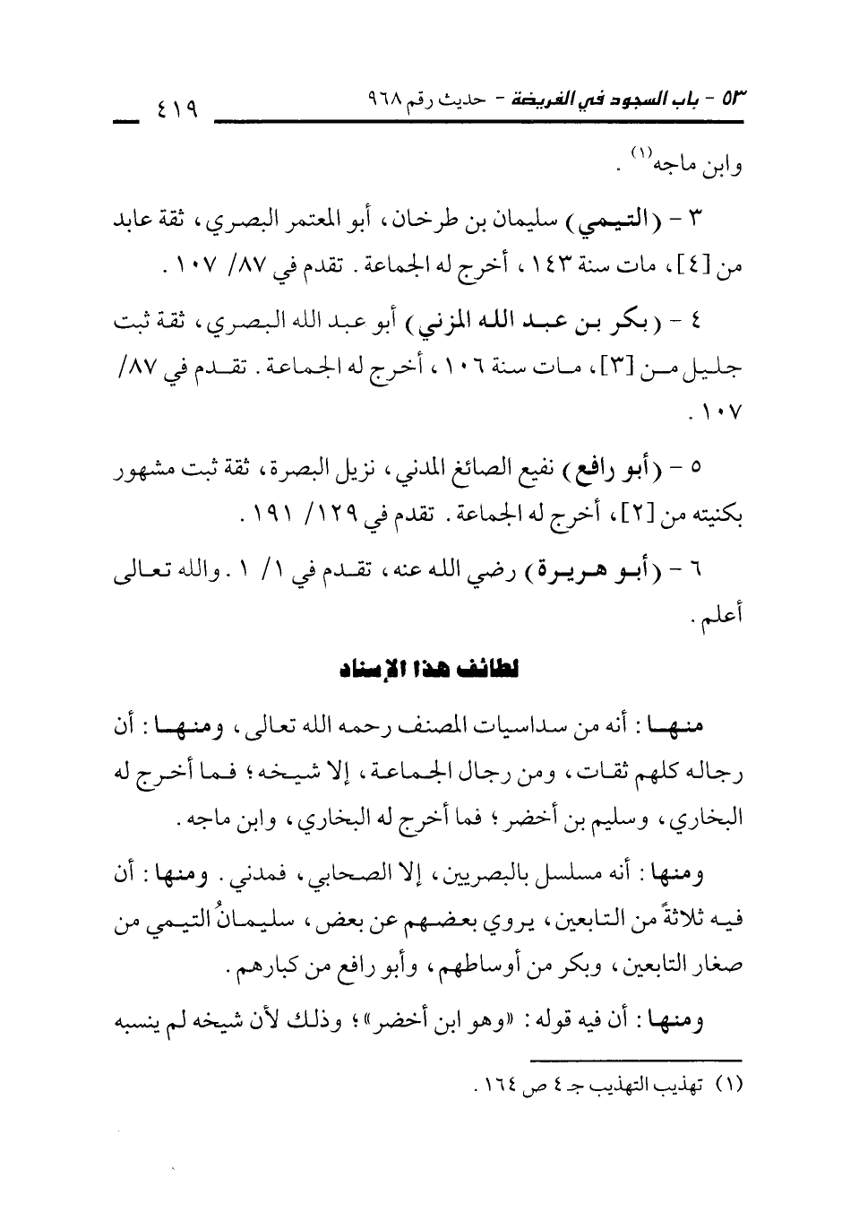 ومنها: أنه مسلسل بالبصريين، إلا الصحابي, فمدني. ومنها: أن فيه ثلاثةً من التالعين, يروي بعضهم عن بعض، سليمانُ التيمي من صغار التابعين، وبكر من أوساطهم، وأبو رافع من كبارهم.