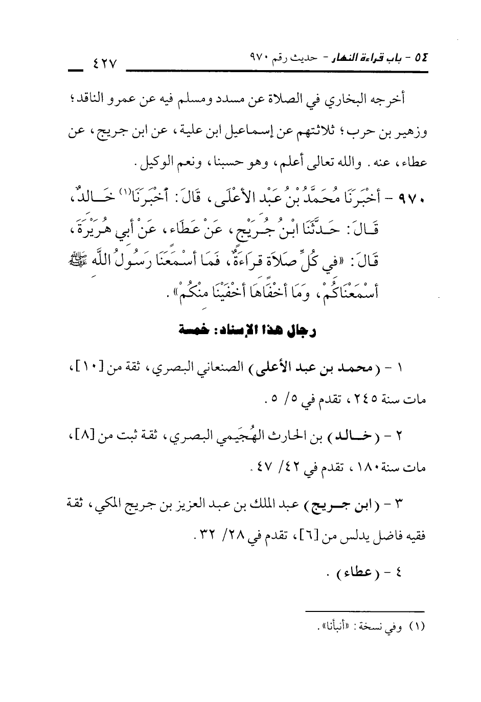 970 - أَخْبَرَنَا مُحَمَّدُ بْنُ عَبْدِ الأَعْلَى، قَالَ: أَنْبَأَنَا (¬1) خَالِدٌ، قَالَ: حَدَّثَنَا ابْنُ جُرَيْجٍ، عَنْ عَطَاءٍ، عَنْ أَبِي هُرَيْرَةَ، قَالَ: "فِي كُلِّ صَلاَةٍ قِرَاءَةٌ، فَمَا أَسْمَعَنَا رَسُولُ اللَّهِ - صلى الله عليه وسلم - أَسْمَعْنَاكُمْ، وَمَا أَخْفَاهَا أَخْفَيْنَا مِنْكُمْ".