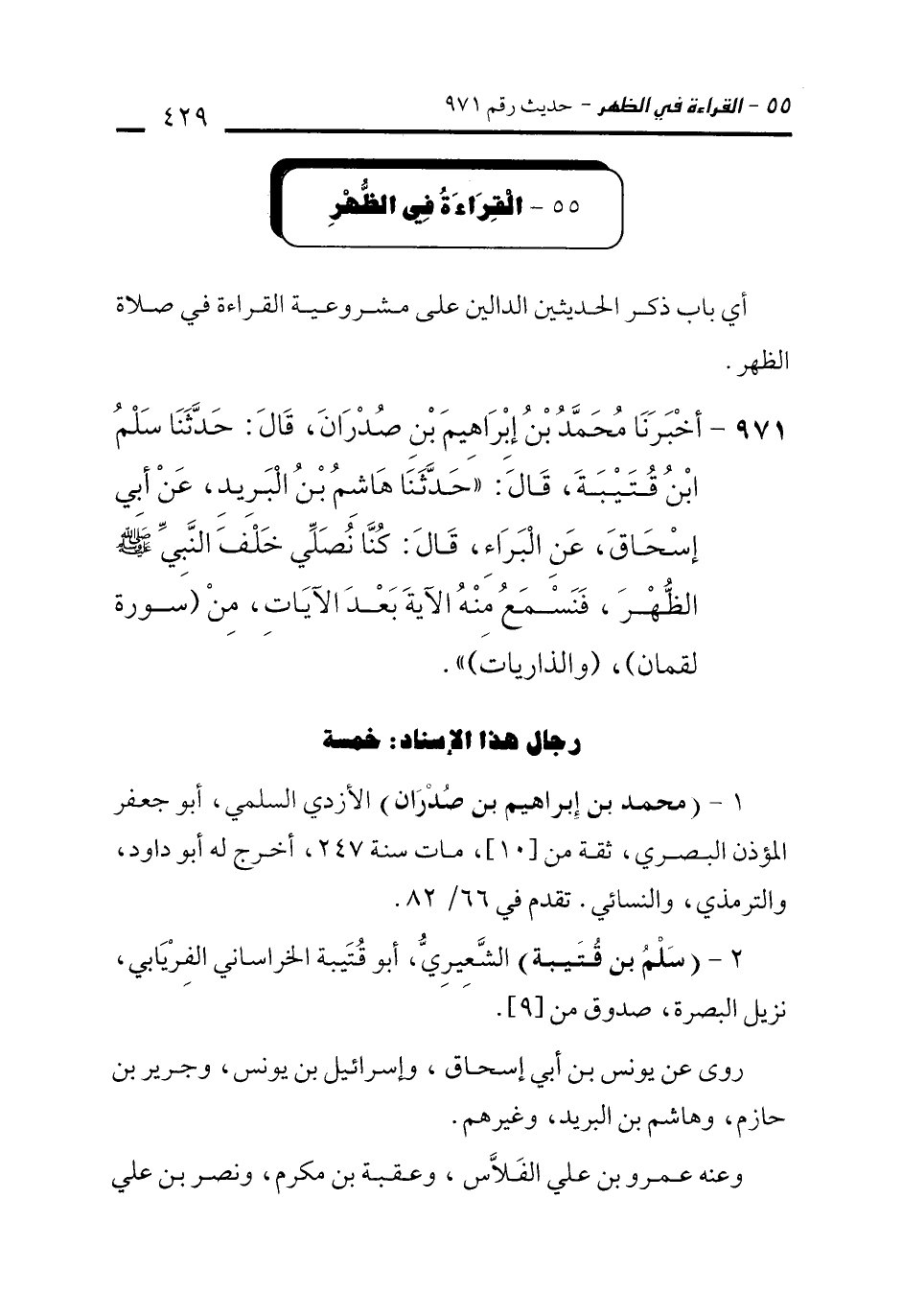 971 - أَخْبَرَنَا مُحَمَّدُ بْنُ إِبْرَاهِيمَ بْنِ صُدْرَانَ، قَالَ: حَدَّثَنَا سَلْمُ بْنُ قُتَيْبَةَ، قَالَ: "حَدَّثَنَا هَاشِمُ بْنُ الْبَرِيدِ، عَنْ أَبِي إِسْحَاقَ، عَنِ الْبَرَاءِ، قَالَ: كُنَّا نُصَلِّي خَلْفَ النَّبِيِّ - صلى الله عليه وسلم - الظُّهْرَ، فَنَسْمَعُ مِنْهُ الآيَةَ بَعْدَ الآيَاتِ، مِنْ (سُورَةِ لُقْمَانَ)، (وَالذَّارِيَاتِ) ".