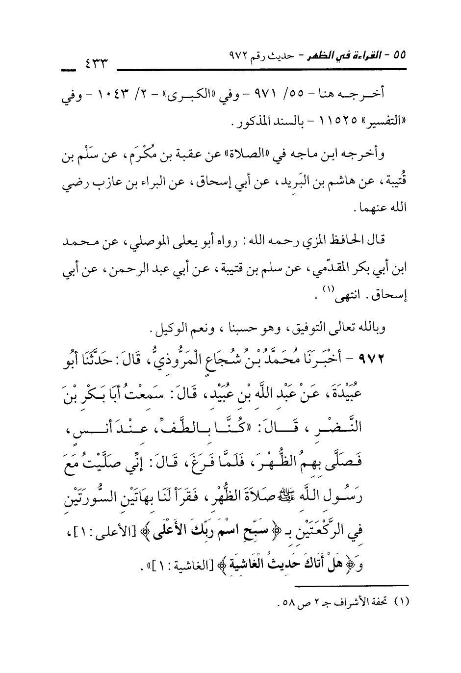 972 - أَخْبَرَنَا مُحَمَّدُ بْنُ شُجَاعٍ الْمَرُّوذِيُّ، قَالَ: حَدَّثَنَا أَبُو عُبَيْدَةَ، عَنْ عَبْدِ اللَّهِ بْنِ عُبَيْدٍ، قَالَ: سَمِعْتُ أَبَا بَكْرِ بْنَ النَّضْرِ، قَالَ: "كُنَّا بِالطَّفِّ، عِنْدَ أَنَسٍ، فَصَلَّى بِهِمُ الظُّهْرَ، فَلَمَّا فَرَغَ، قَالَ: إِنِّي صَلَّيْتُ مَعَ رَسُولِ اللَّهِ - صلى الله عليه وسلم - صَلاَةَ الظُّهْرِ، فَقَرَأَ لَنَا بِهَاتَيْنِ السُّورَتَيْنِ فِي الرَّكْعَتَيْنِ بِـ {سَبِّحِ اسْمَ رَبِّكَ الْأَعْلَى (1)} [الأعلى: 1] وَ {هَلْ أَتَاكَ حَدِيثُ الْغَاشِيَةِ (1)} [الغاشية: 1].