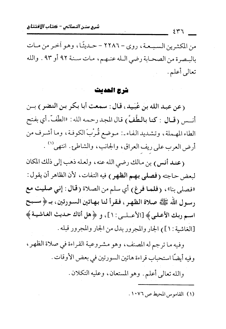 (عند أنس) بن مالك رضي الله عنه، ولعله ذهب إلى ذلك المكان لبعض حاجته (فصلى بهم الظهر) فيه التفات, لأن الظاهر أن يقول: "فصلى بنا"، (فلما فرغ) أي سلم من الصلاة (قال: إِني صليت مع رسول الله - صلى الله عليه وسلم - صلاة الظهر، فقرأ لنا بهاتين السورتين، بـ {سبح اسم ربك الأعلى} [الأعلى: 1]، و {هل أتاك حديث الغاشية} [الغاشية: 1]) الجار والمجرور بدل من الجار والمجرور قبله.
