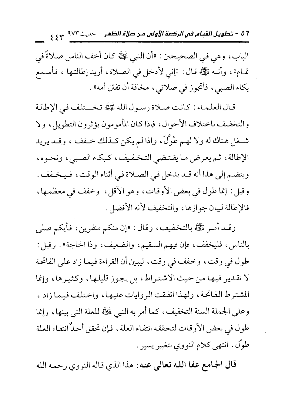 قال العلماء: كانت صلاة رسول الله - صلى الله عليه وسلم - تختلف في الإطالة والتخفيف باختلاف الأحوال، فإذا كان المأمومون يؤثرون التطويل، ولا شغل هناك له ولا لهم طَوَّلَ، وإذا لم يكن كذلك خفف، وقد يريد الإطالة، ثم يعرض ما يقتضي التخفيف، كبكاء الصبي، ونحوه، وينضم إلى هذا أنه قد يدخل في الصلاة في أثناء الوقت، فيخفف. وقيل: إنما طول في بعض الأوقات، وهو الأقل، وخفف في معظمها، فالإطالة لبيان جوازها، والتخفيف لأنه الأفضل.