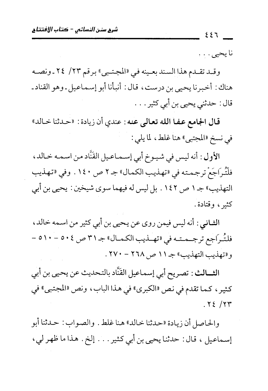 الثالث: تصريح أبي إسماعيل القَنَّاد بالتحديث عن يحيى بن أبي كثير، كما تقدم في نص "الكبرى" في هذا الباب، ونص "المجتبى" في 23/ 24.